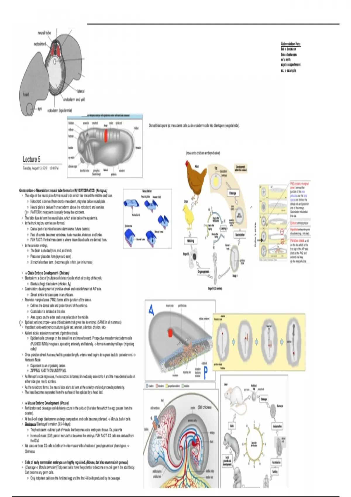 Typed class notes covering lecture 5 in the Development Biology course (code BioD104) at University of California, Irvine. Made by a biology student taking said course over a summer session. Document comes with color-coded notes and textbook diagrams.