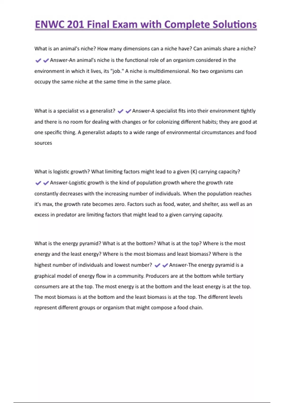 ENWC 201 Final Exam with Complete Solutions What is an animal's niche? How many dimensions can a niche have? Can animals share a niche? Answer-An animal's niche is the functional role of an organism considered in the environment in which it lives, its "job." A niche is multidimensional. No two organisms can occupy the same niche at the same time in the same place. What is a specialist vs a generalist? Answer-A specialist fits into their environment tightly and there is no room for dealing with changes or for colonizing different habits; they are good at one specific thing. A generalist adapts to a wide range of environmental circumstances and food