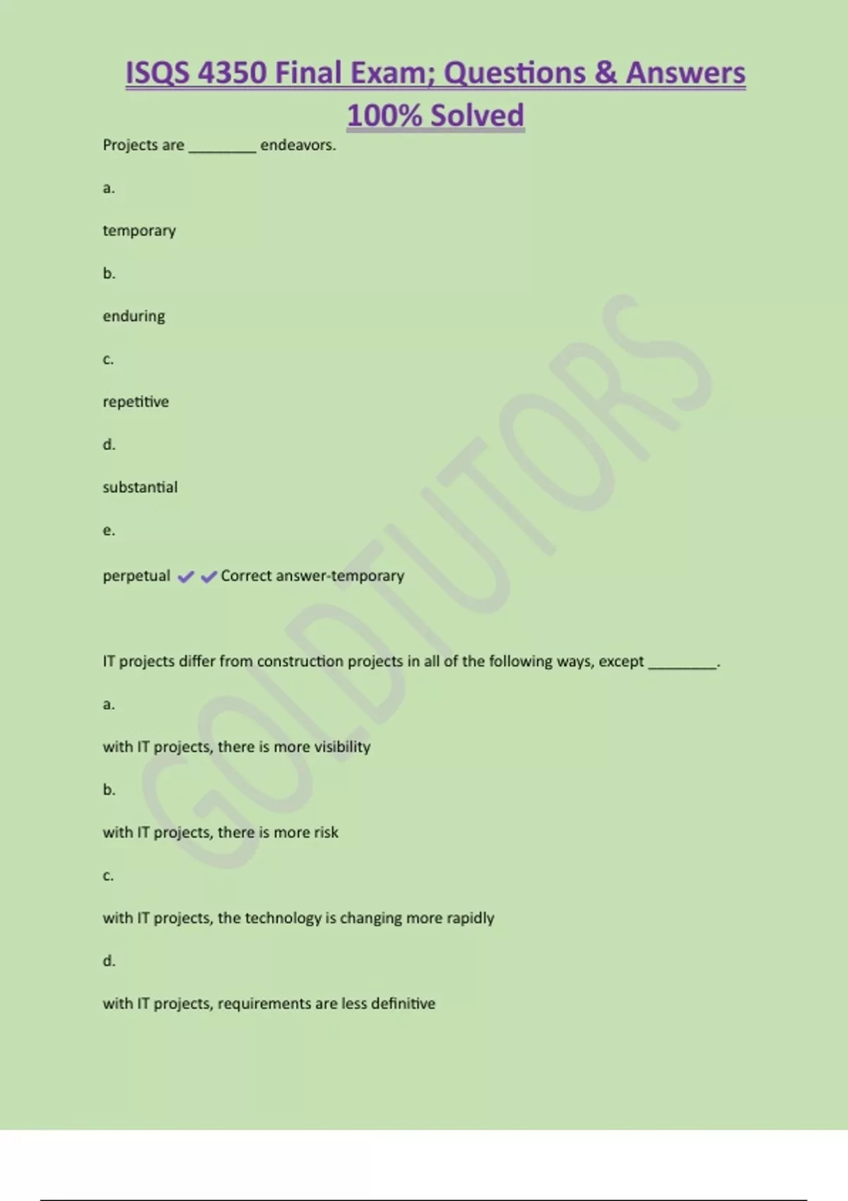 ISQS 4350 Final Exam; Questions & Answers 100% Solved Projects are ________ endeavors. a. temporary b. enduring c. repetitive d. substantial e. perpetual Correct answer-temporary IT projects differ from construction projects in all of the following ways, except ________. a. with IT projects, there is more visibility b. with IT projects, there is more risk c. with IT projects, the technology is changing more rapidly d. with IT projects, requirements are less definitiv