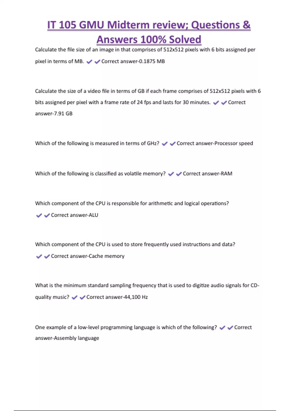 IT 105 GMU Midterm review; Questions & Answers 100% Solved Calculate the file size of an image in that comprises of 512x512 pixels with 6 bits assigned per pixel in terms of MB. Correct answer-0.1875 MB Calculate the size of a video file in terms of GB if each frame comprises of 512x512 pixels with 6 bits assigned per pixel with a frame rate of 24 fps and lasts for 30 minutes. Correct answer-7.91 GB Which of the following is measured in terms of GHz? Correct answer-Processor speed Which of the following is classified as volatile memory? Correct answer-RAM Which component of the CPU is responsible for arithmetic and logical operations?