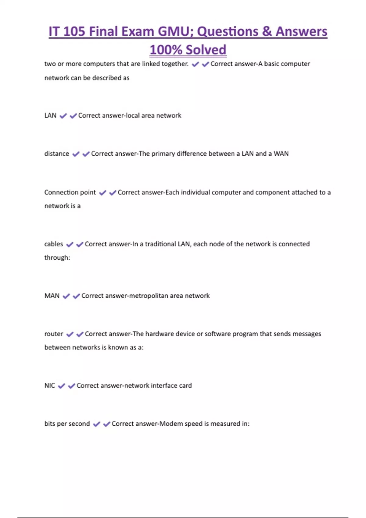 IT 105 Final Exam GMU; Questions & Answers 100% Solved two or more computers that are linked together. Correct answer-A basic computer network can be described as LAN Correct answer-local area network distance Correct answer-The primary difference between a LAN and a WAN Connection point Correct answer-Each individual computer and component attached to a network is a cables Correct answer-In a traditional LAN, each node of the network is connected through