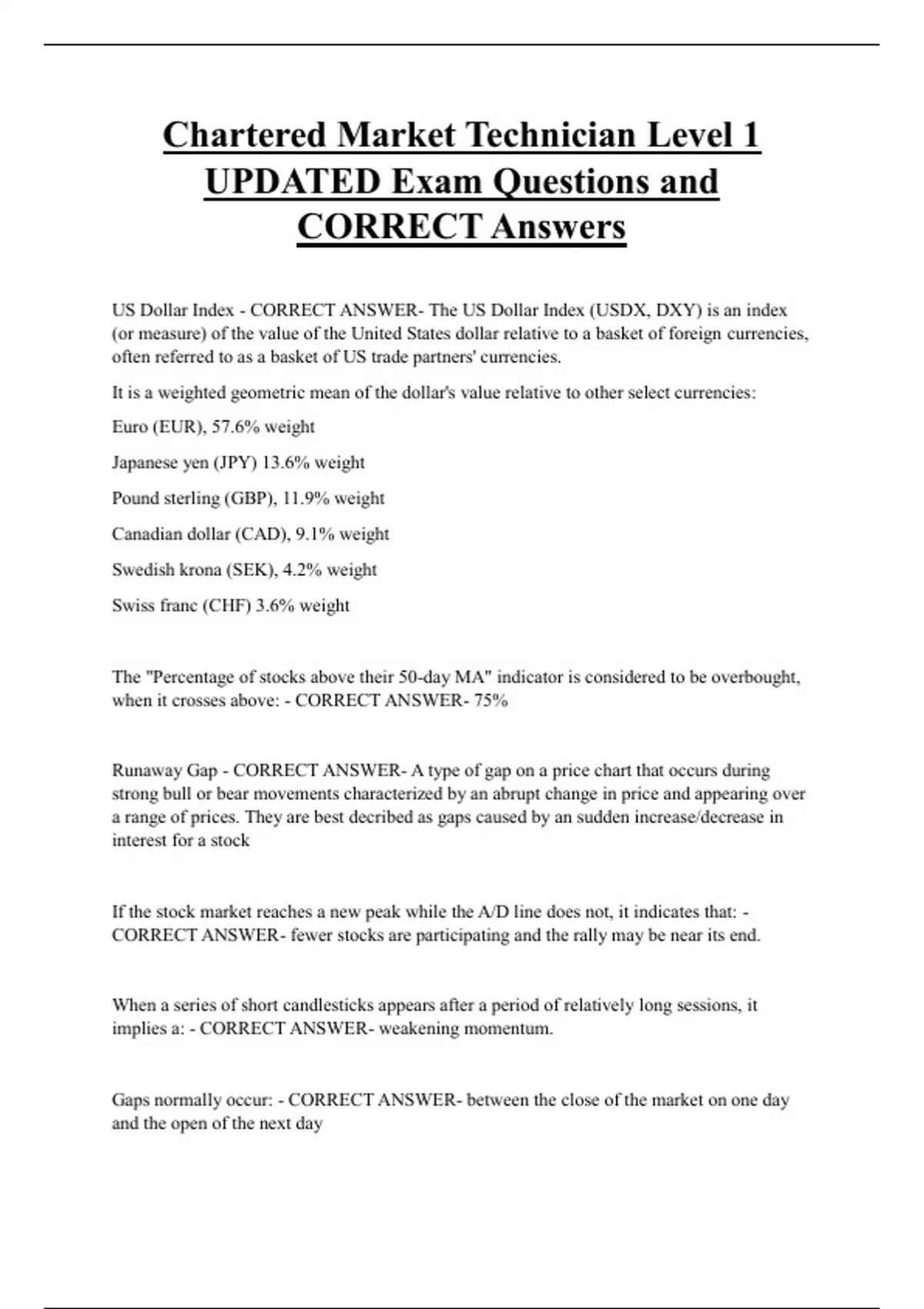 Chartered Market Technician Level 1 UPDATED Exam Questions and CORRECT Answers US Dollar Index - CORRECT ANSWER- The US Dollar Index (USDX, DXY) is an index (or measure) of the value of the United States dollar relative to a basket of foreign currencies, often referred to as a basket of US trade partners' currencies. It is a weighted geometric mean of the dollar's value relative to other select currencies: Euro (EUR), 57.6% weight Japanese yen (JPY) 13.6% weight Pound sterling (GBP), 11.9% weight Canadian dollar (CAD), 9.1% weight Swedish krona (SEK), 4.2% weight Swiss franc (CHF) 3.6% weight
