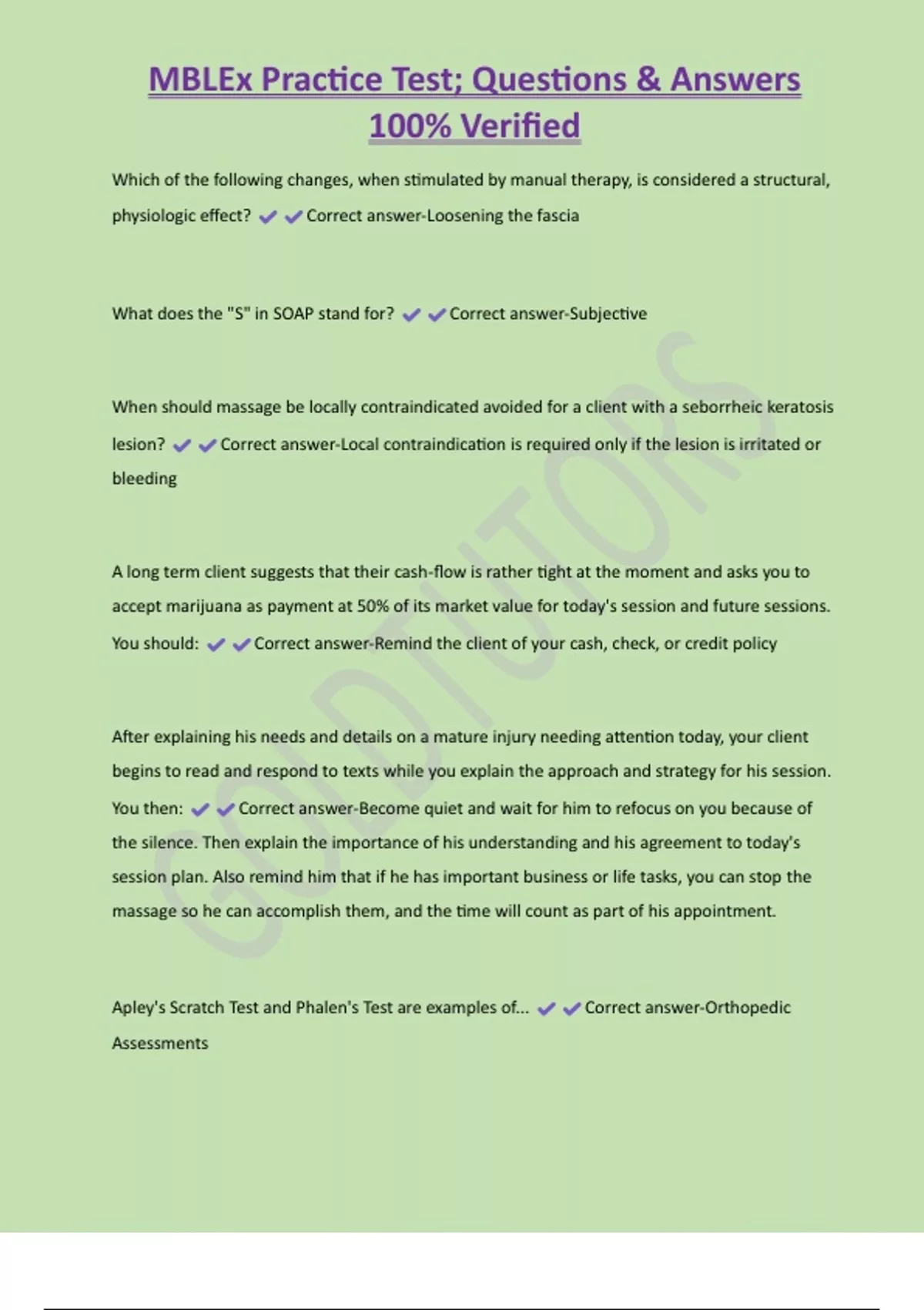 MBLEx Practice Test; Questions & Answers 100% Verified Which of the following changes, when stimulated by manual therapy, is considered a structural, physiologic effect? Correct answer-Loosening the fascia What does the "S" in SOAP stand for? Correct answer-Subjective When should massage be locally contraindicated avoided for a client with a seborrheic keratosis lesion? Correct answer-Local contraindication is required only if the lesion is irritated or bleeding