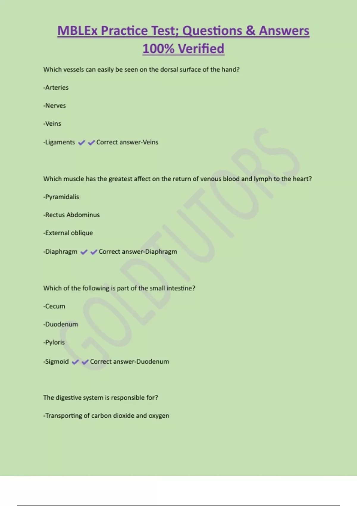 MBLEx Practice Test; Questions & Answers 100% Verified Which vessels can easily be seen on the dorsal surface of the hand? -Arteries -Nerves -Veins -Ligaments Correct answer-Veins Which muscle has the greatest affect on the return of venous blood and lymph to the heart? -Pyramidalis -Rectus Abdominus -External oblique -Diaphragm Correct answer-Diaphragm