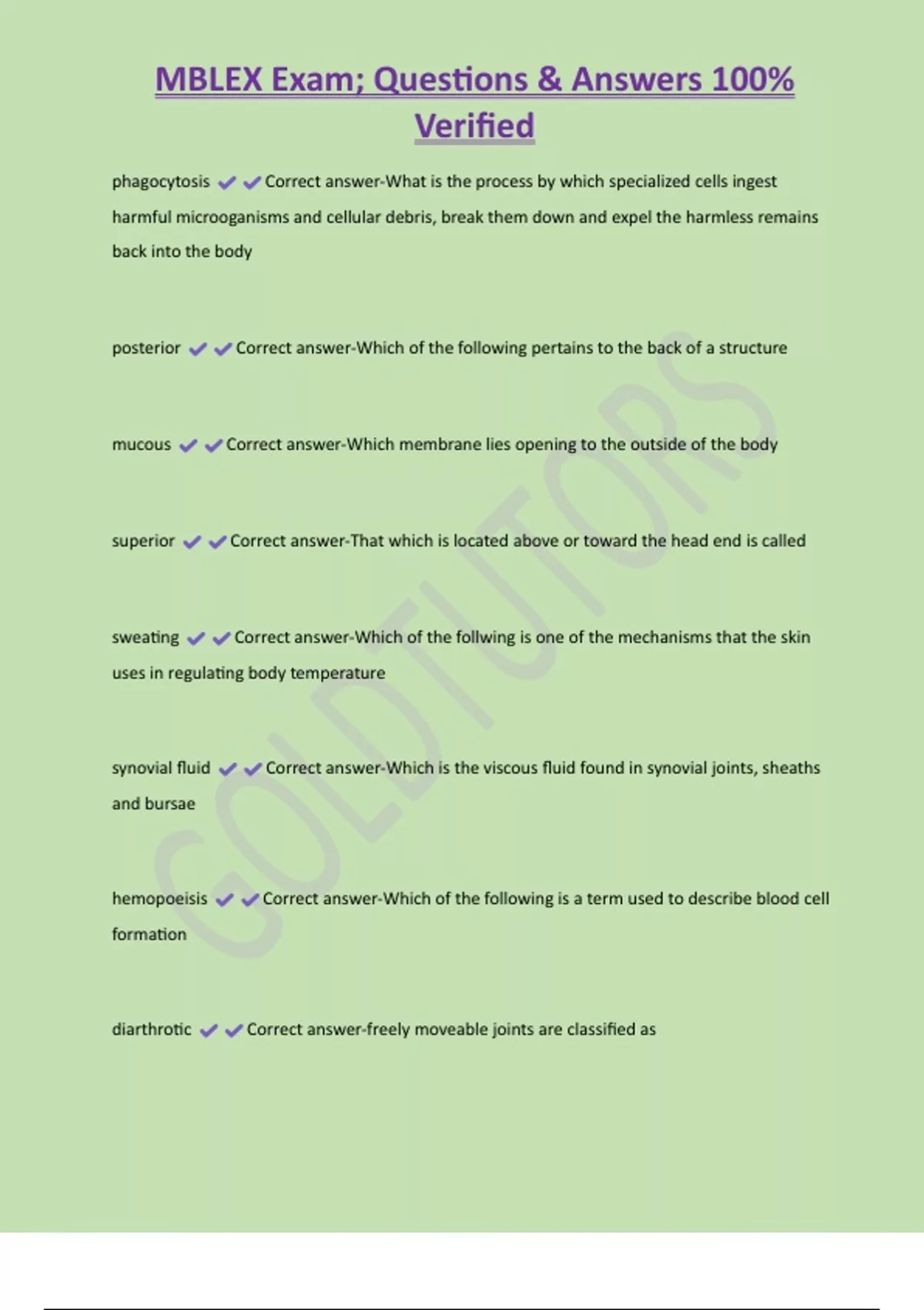 MBLEX Exam; Questions & Answers 100% Verified phagocytosis Correct answer-What is the process by which specialized cells ingest harmful microoganisms and cellular debris, break them down and expel the harmless remains back into the body posterior Correct answer-Which of the following pertains to the back of a structure mucous Correct answer-Which membrane lies opening to the outside of the body superior Correct answer-That which is located above or toward the head end is called sweating Correct answer-Which of the follwing is one of the mechanisms that the skin uses in regulating body temperature