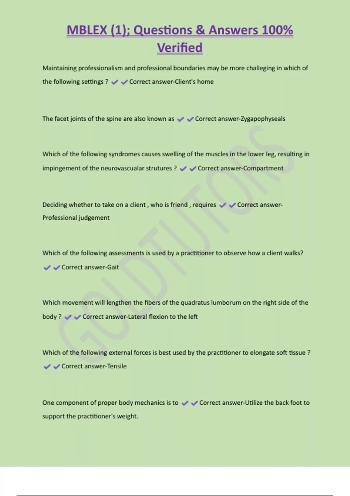 MBLEX (1); Questions & Answers 100% Verified Maintaining professionalism and professional boundaries may be more challeging in which of the following settings ? Correct answer-Client's home The facet joints of the spine are also known as Correct answer-Zygapophyseals Which of the following syndromes causes swelling of the muscles in the lower leg, resulting in impingement of the neurovascualar strutures ? Correct answer-Compartmen