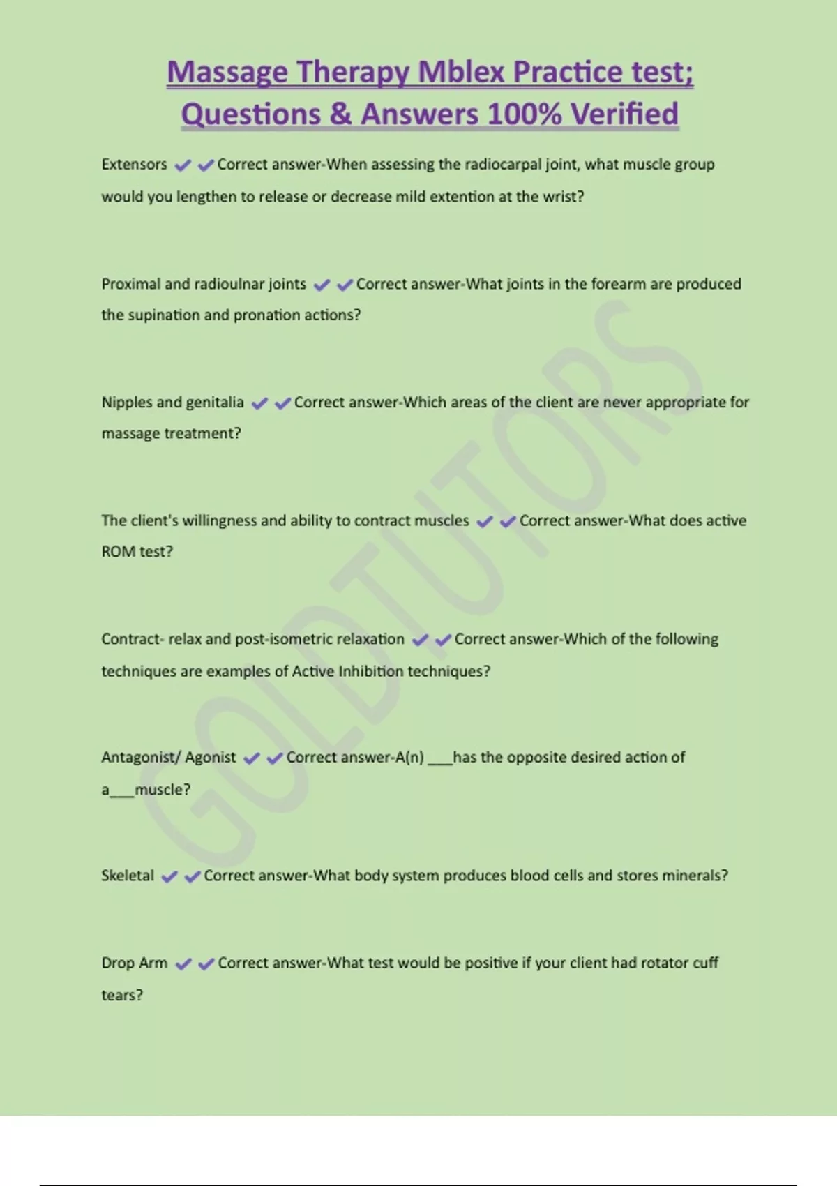Massage Therapy Mblex Practice test; Questions & Answers 100% Verified Extensors Correct answer-When assessing the radiocarpal joint, what muscle group would you lengthen to release or decrease mild extention at the wrist? Proximal and radioulnar joints Correct answer-What joints in the forearm are produced the supination and pronation actions? Nipples and genitalia Correct answer-Which areas of the client are never appropriate for massage treatment?