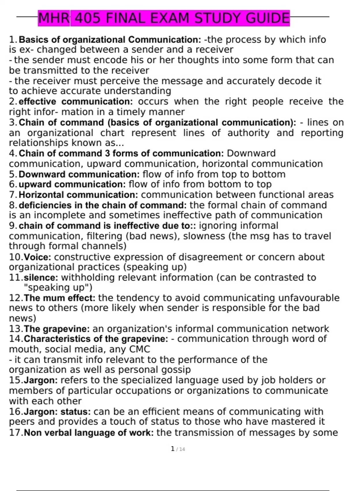 MHR 405 FINAL EXAM STUDY GUIDE 1. Basics of organizational Communication: -the process by which info is ex- changed between a sender and a receiver - the sender must encode his or her thoughts into some form that can be transmitted to the receiver - the receiver must perceive the message and accurately decode it to achieve accurate understanding 2. effective communication: occurs when the right people receive the right infor- mation in a timely manner 3. Chain of command (basics of organizational communication): - lines on an organizational chart represent lines of authority and reporting relationships known as... 4. Chain of command 3 forms of communication: Downward communication, upward communication, horizontal communication