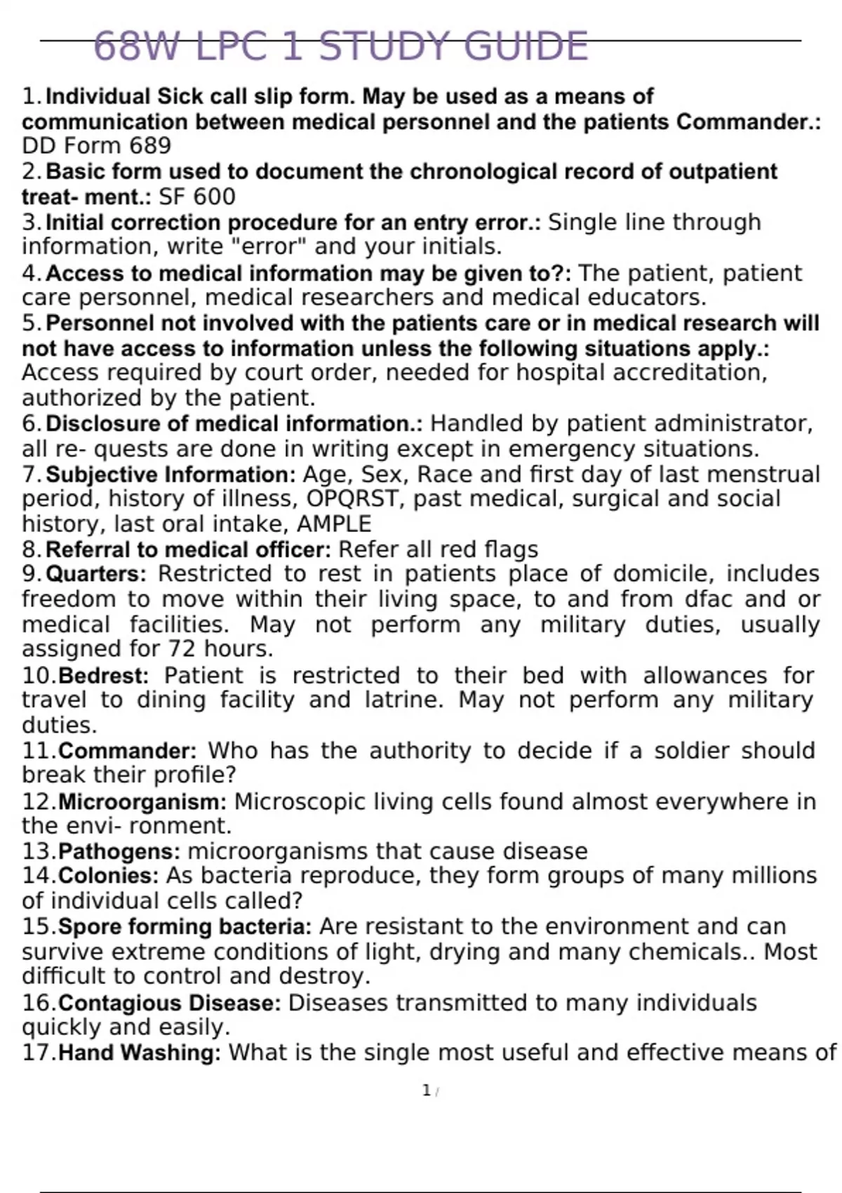 68W LPC 1 STUDY GUIDE 1. Individual Sick call slip form. May be used as a means of communication between medical personnel and the patients Commander.: DD Form 689 2. Basic form used to document the chronological record of outpatient treat- ment.: SF 600 3. Initial correction procedure for an entry error.: Single line through information, write "error" and your initials. 4. Access to medical information may be given to?: The patient, patient care personnel, medical researchers and medical educators. 5. Personnel not involved with the patients care or in medical research will not have access to information unless the following situations apply.: Access required by court order, needed for hospital accreditation, authorized by the patient. 6. Disclosure of medical information.: Handled by patient administrator, all re- quests are done in writing except in emergency situations