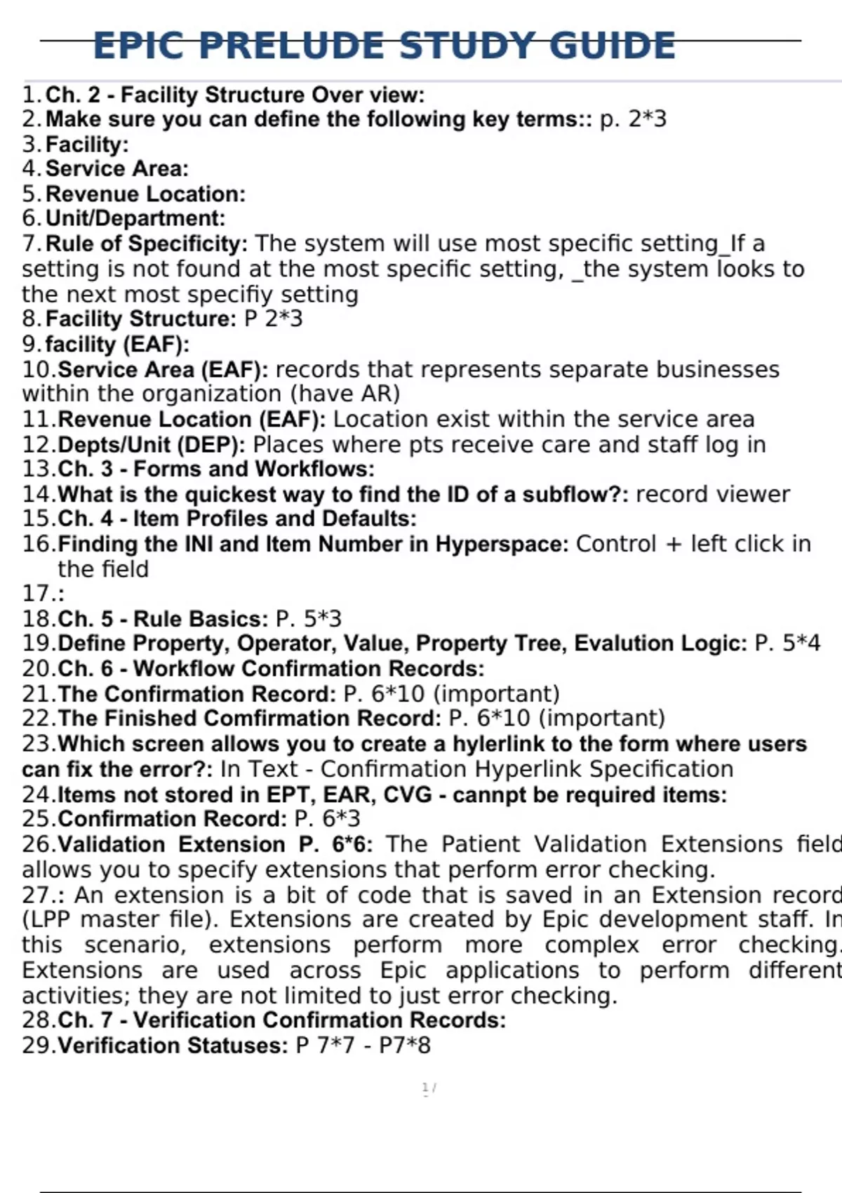 EPIC PRELUDE STUDY GUIDE 1. Ch. 2 - Facility Structure Over view: 2. Make sure you can define the following key terms:: p. 2*3 3. Facility: 4. Service Area: 5. Revenue Location: 6. Unit/Department: 7. Rule of Specificity: The system will use most specific setting_If a setting is not found at the most specific setting, _the system looks to the next most specifiy setting 8. Facility Structure: P 2*3 9. facility (EAF): 10. Service Area (EAF): records that represents separate businesses within the organization (have AR) 11. Revenue Location (EAF): Location exist within the service area 12. Depts/Unit (DEP): Places where pts receive care and staff log in 13. Ch. 3 - Forms and Workflows