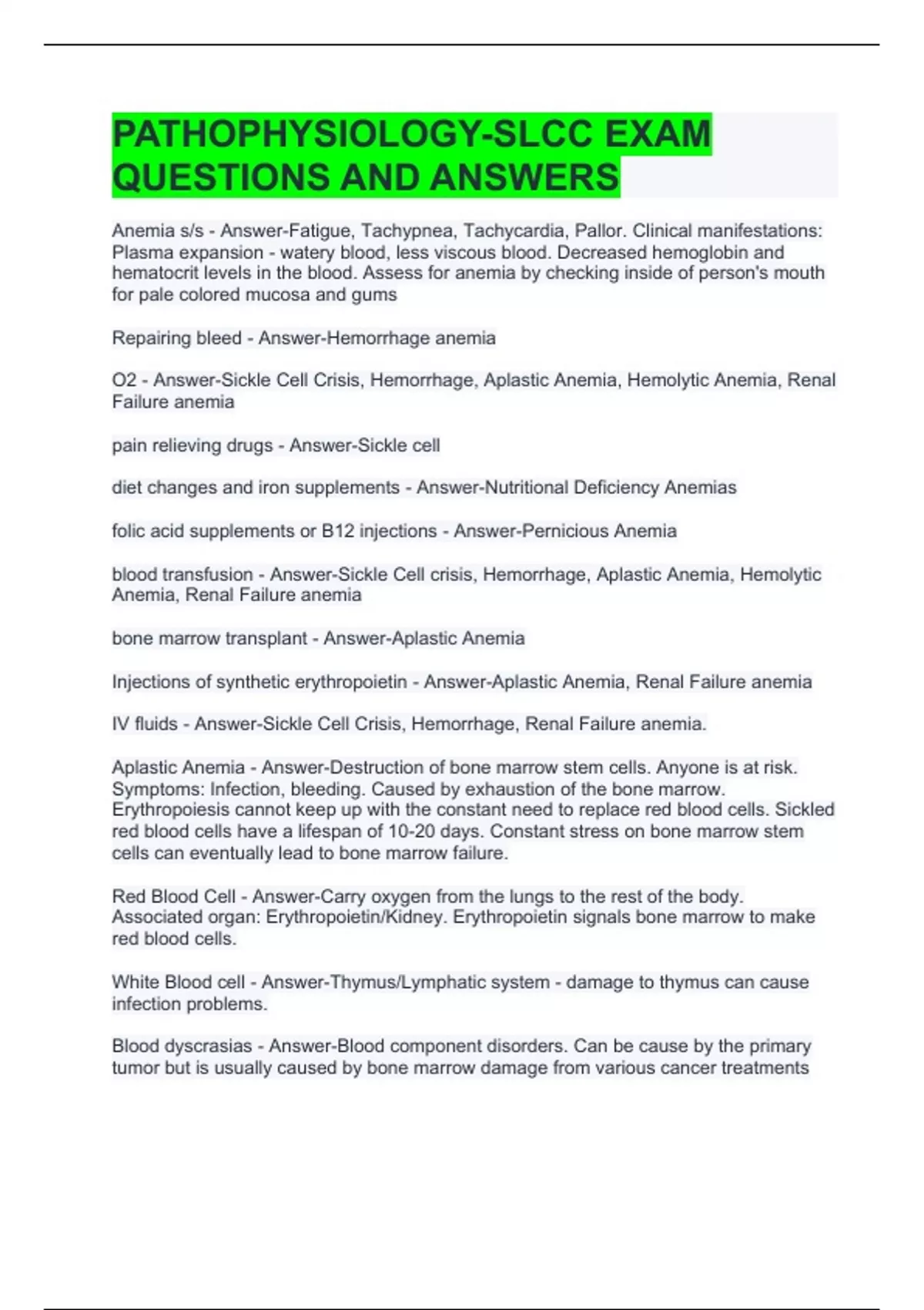 PATHOPHYSIOLOGY-SLCC EXAM QUESTIONS AND ANSWERS