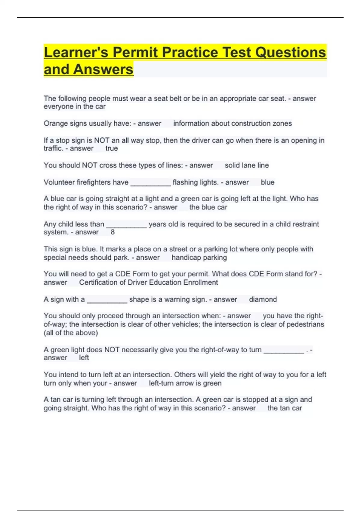 Learner's Permit Practice Test Questions and Answers The following people must wear a seat belt or be in an appropriate car seat. everyone in the car Orange signs usually have: information about construction zones Previous Play Next Rewind 10 seconds Move forward 10 seconds Unmute 0:01 / 0:54 Full screen 6 Ways to Show Appreciation for Your Child's Teacher If a stop sign is NOT an all way stop, then the driver can go when there is an opening in traffic. true You should NOT cross these types of lines: solid lane line Volunteer firefighters have __________ flashing lights. blue A blue car is going straight at a light and a green car is going left at the light. Who has the right of way in this scenario? the blue car Any child less than __________ years old is required to be secured in a child restraint system. 8 This sign is blue. It marks a place on a street or a parking lot where only people with special needs should park. handicap parking You will need to get a CDE Form to get your permit. What does CDE Form stand for? Certification of Driver Education Enrollment A sign with a __________ shape is a warning sign. diamond You should only proceed through an intersection when: you have the right-of-way; the intersection is clear of other vehicles; the intersection is clear of pedestrians (all of the above) A green light does NOT necessarily give you the right-of-way to turn __________ . left You intend to turn left at an intersection. Others will yield the right of way to you for a left turn only when your left-turn arrow is green A tan car is turning left through an intersection. A green car is stopped at a sign and going straight. Who has the right of way in this scenario? the tan car Police cars, ambulances, fire trucks, and rescue vehicles flash __________ lights. red These vehicles are equipped with yellow flashing lights. construction or utility vehicle This diamond shaped sign warns you that there may be people crossing the road. pedestrian crossing Which of the following should you NOT do in snow: Start braking sooner so that you don't have to brake as hard In Indiana, the maximum speed allowed on Interstate Highways is: 70mph A good rule of thumb is to maintain a following distance of __________ seconds in good conditions. 2 In order to prepare for driving in heavy rain, make sure to be prepared to react These vehicles are marked with a special triangle reflector. SMVs Before you make a right turn on red, make sure that there is NOT a "No Turn on Red" sign; you have yielded the right of way to any other cars; there are no pedestrians in the crosswalk (all of the above) Do NOT get yourself trapped in a bad situation by being too __________ to the car in front of you. close A pink car is at an intersection and turning left. A red car is approaching the same intersection and turning left. The pink car has a green arrow and the red car has a red light. Who has the right of way in this scenario? pink car Two way traffic should be separated by: yellow lines If you are enrolled in Driver's Education, then you can get your Learner's Permit at this age: 15 years old The person that has the right-of-way at an intersection should: proceed through the intersection with caution A green light does NOT necessarily give you the right-of-way to turn __________ . left
