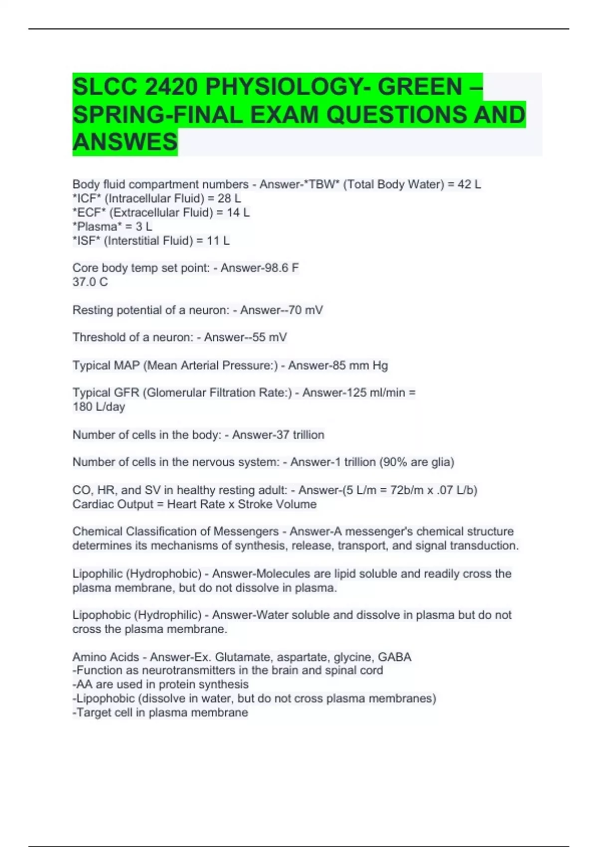 SLCC 2420 PHYSIOLOGY- GREEN – SPRING-FINAL EXAM QUESTIONS AND ANSWES