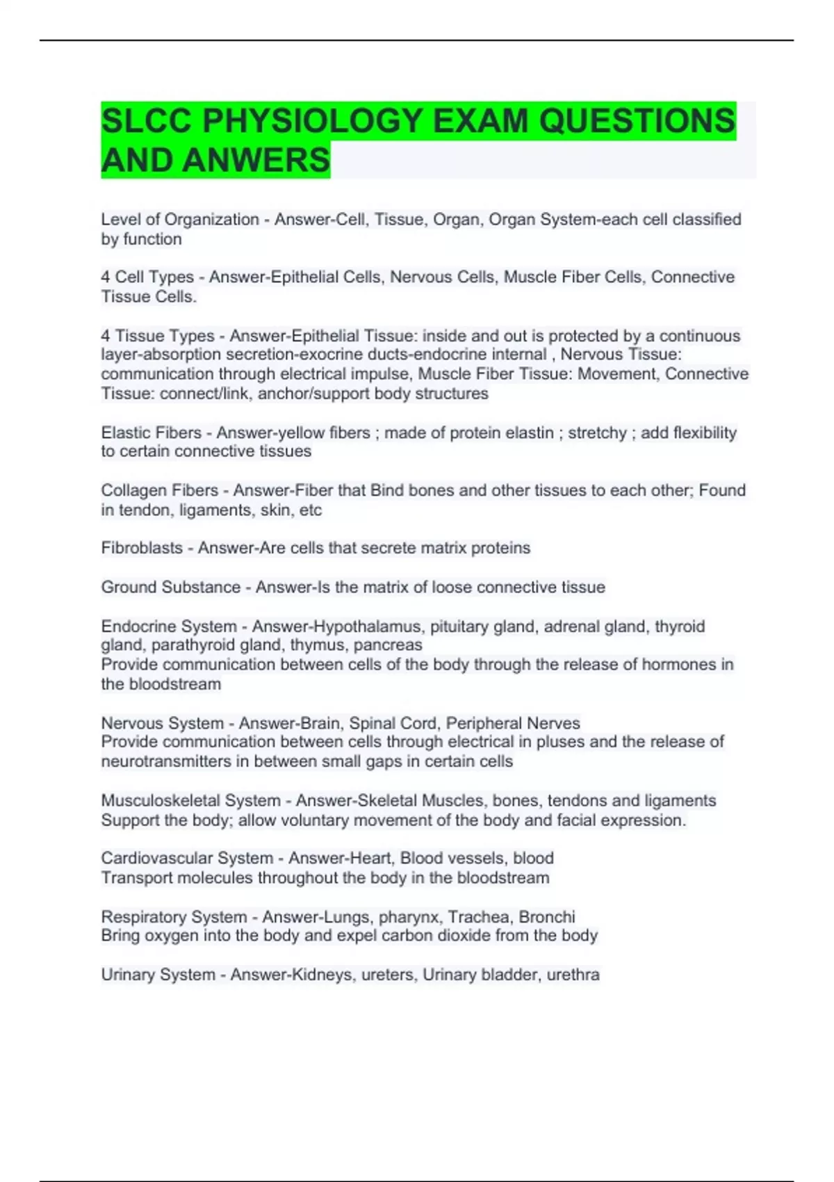 SLCC PHYSIOLOGY EXAM QUESTIONS AND ANWERS