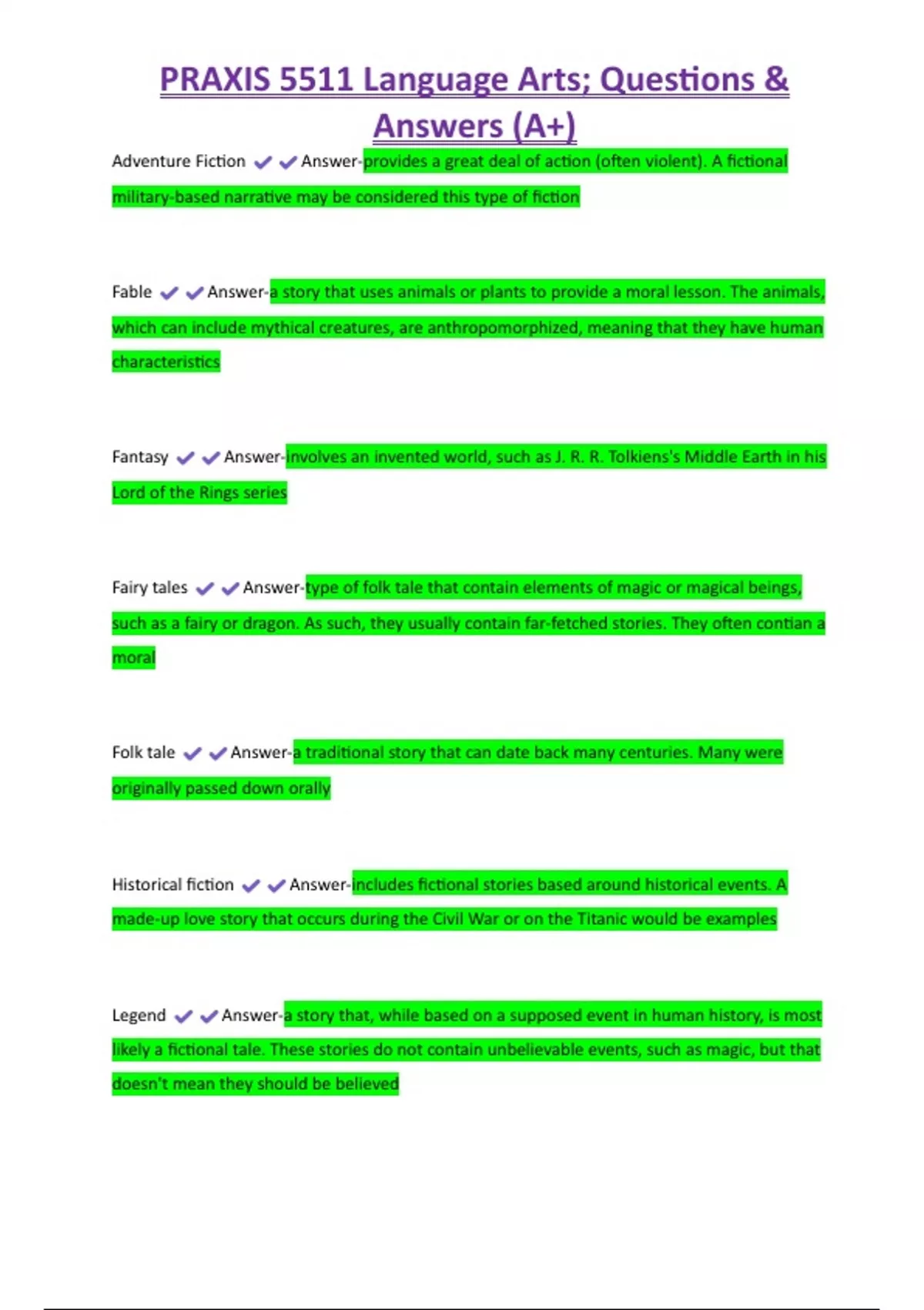 PRAXIS 5511 Language Arts; Questions & Answers (A+) Adventure Fiction Answer-provides a great deal of action (often violent). A fictional military-based narrative may be considered this type of fiction Fable Answer-a story that uses animals or plants to provide a moral lesson. The animals, which can include mythical creatures, are anthropomorphized, meaning that they have human characteristics Fantasy Answer-involves an invented world, such as J. R. R. Tolkiens's Middle Earth in his Lord of the Rings series Fairy tales Answer-type of folk tale that contain elements of magic or magical beings, such as a fairy or dragon. As such, they usually contain far-fetched stories. They often contian a moral
