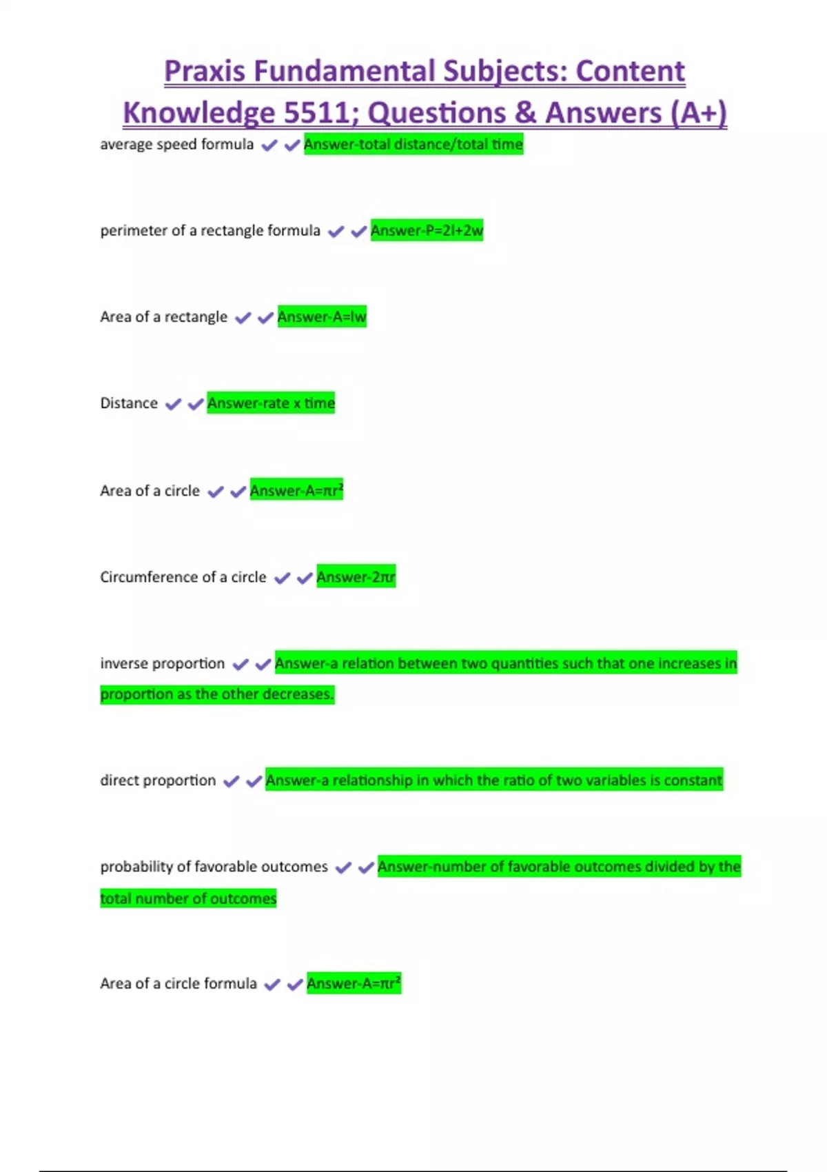 Praxis Fundamental Subjects: Content Knowledge 5511; Questions & Answers (A+) average speed formula Answer-total distance/total time perimeter of a rectangle formula Answer-P=2l+2w Area of a rectangle Answer-A=lw Distance Answer-rate x time Area of a circle Answer-A=πr² Circumference of a circle Answer-2πr