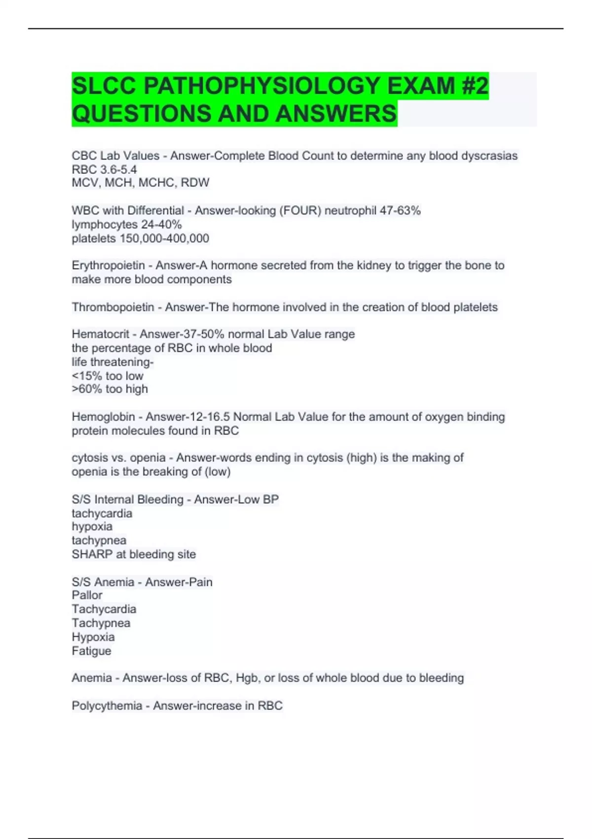 SLCC PATHOPHYSIOLOGY EXAM #2