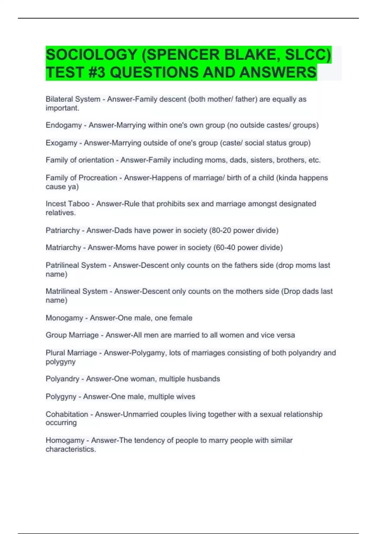 SOCIOLOGY (SPENCER BLAKE, SLCC) TEST #3 QUESTIONS AND ANSWERS