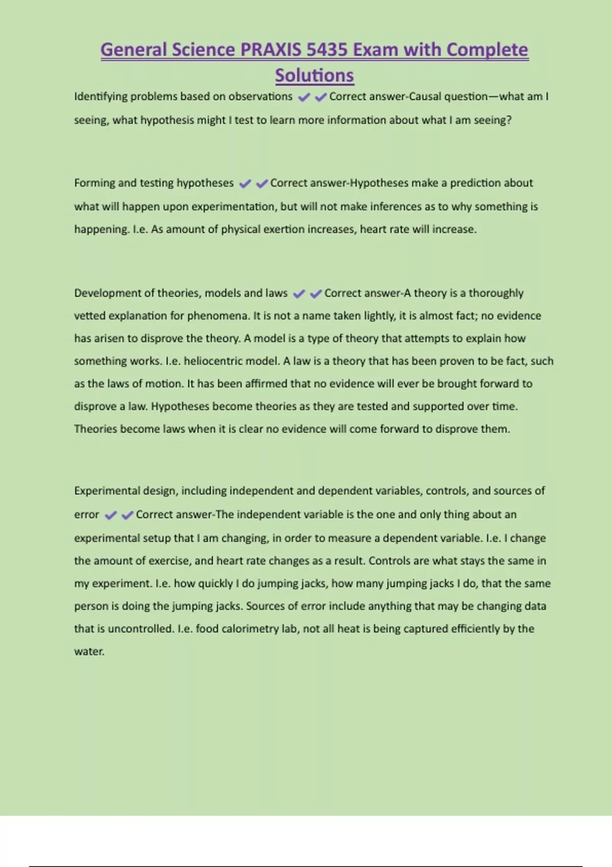 General Science PRAXIS 5435 Exam with Complete Solutions Identifying problems based on observations Correct answer-Causal question—what am I seeing, what hypothesis might I test to learn more information about what I am seeing? Forming and testing hypotheses Correct answer-Hypotheses make a prediction about what will happen upon experimentation, but will not make inferences as to why something is happening. I.e. As amount of physical exertion increases, heart rate will increase