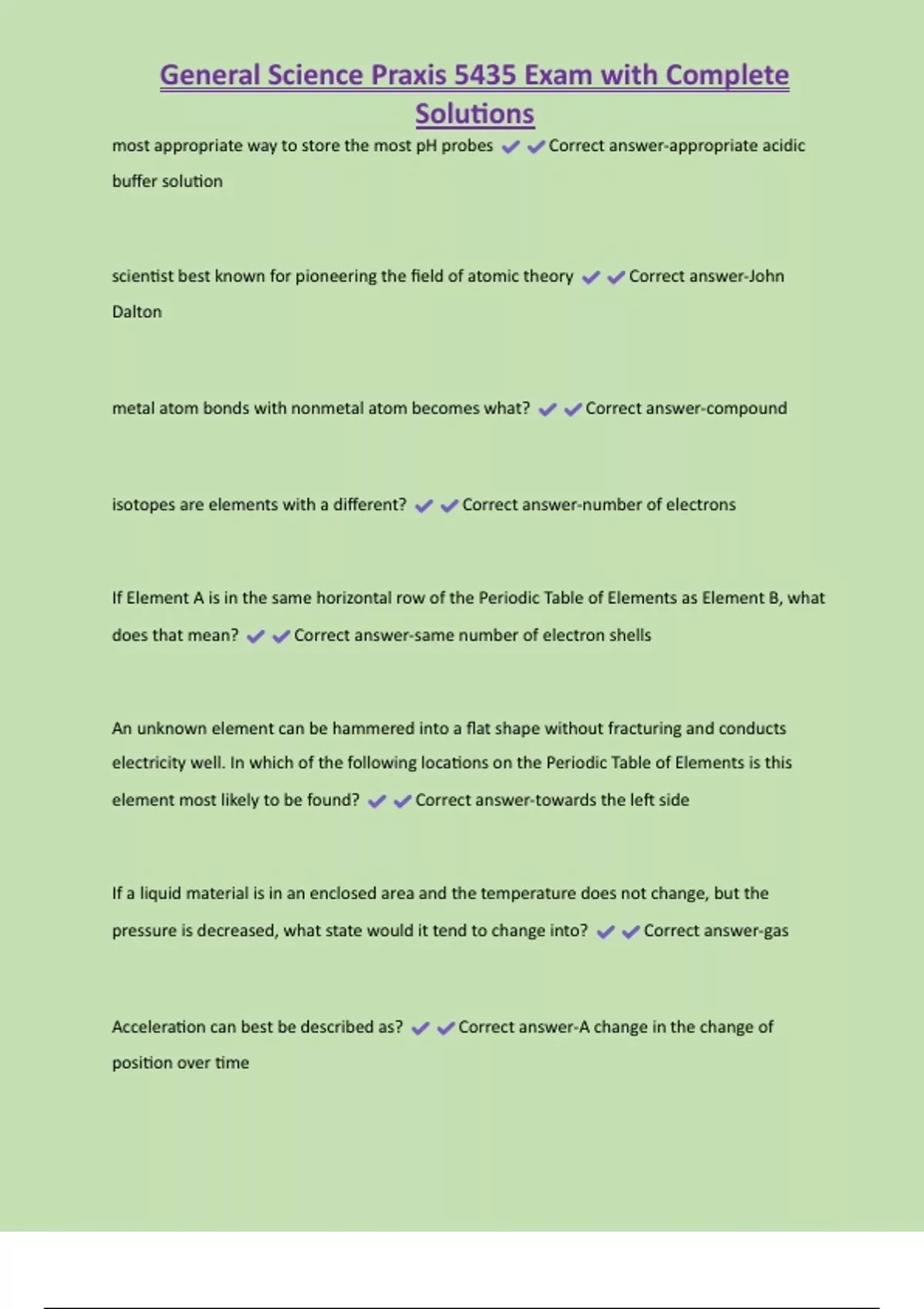 General Science Praxis 5435 Exam with Complete Solutions most appropriate way to store the most pH probes Correct answer-appropriate acidic buffer solution scientist best known for pioneering the field of atomic theory Correct answer-John Dalton metal atom bonds with nonmetal atom becomes what? Correct answer-compound isotopes are elements with a different? Correct answer-number of electrons