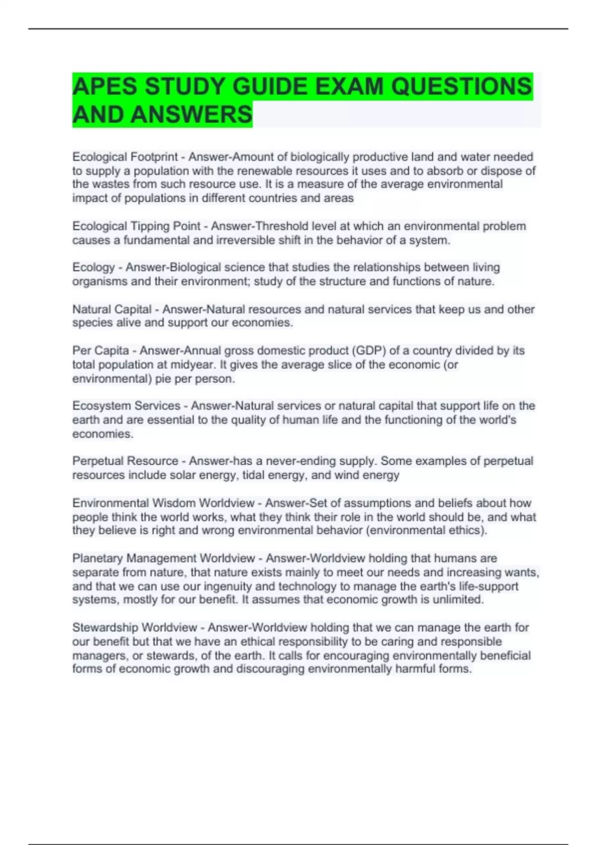 APES STUDY GUIDE EXAM QUESTIONS