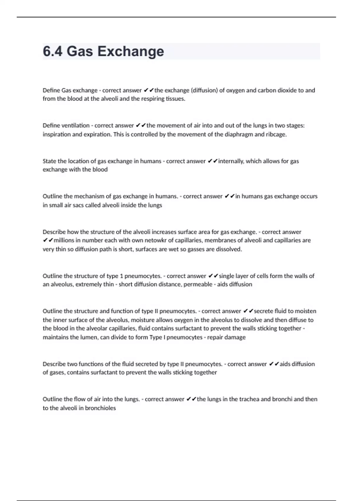 Define Gas exchange - correct answer ✔✔the exchange (diffusion) of oxygen and carbon dioxide to and