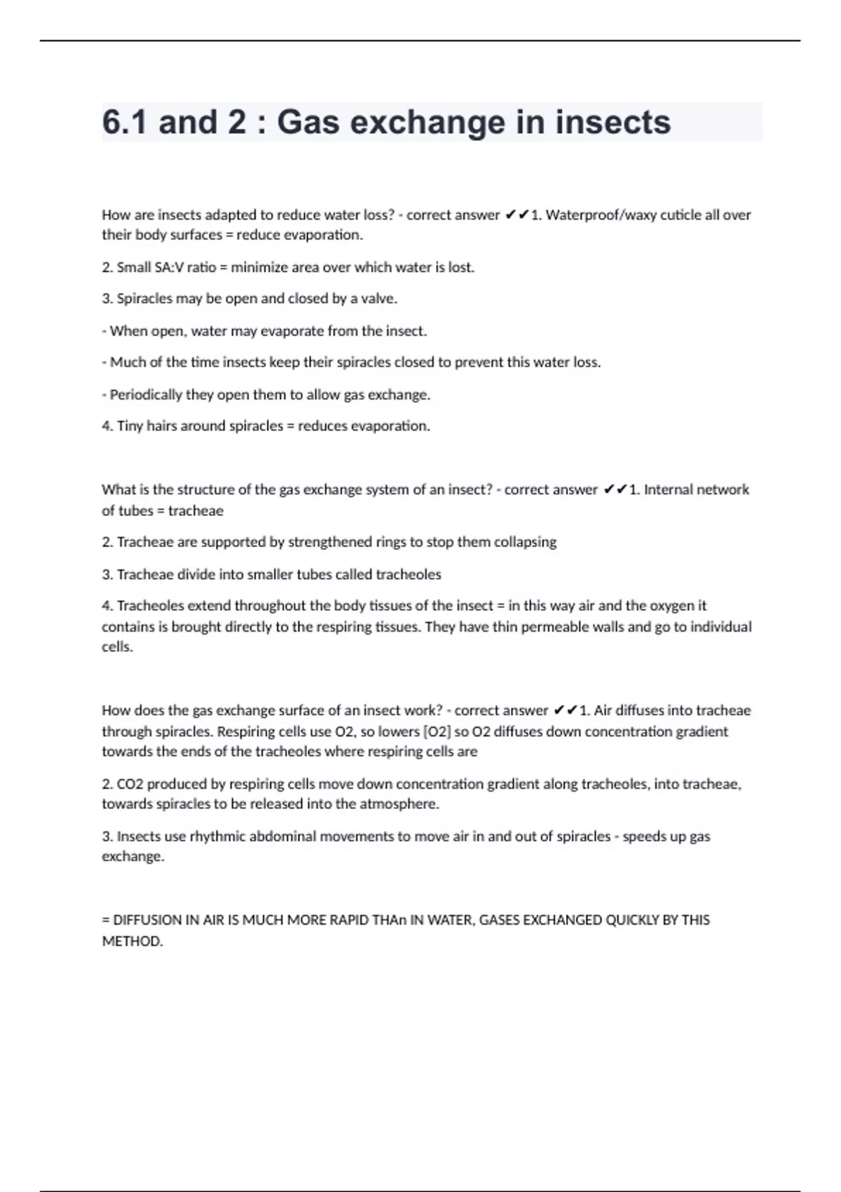 6.1 and 2 : Gas exchange in insects with verified correct answers