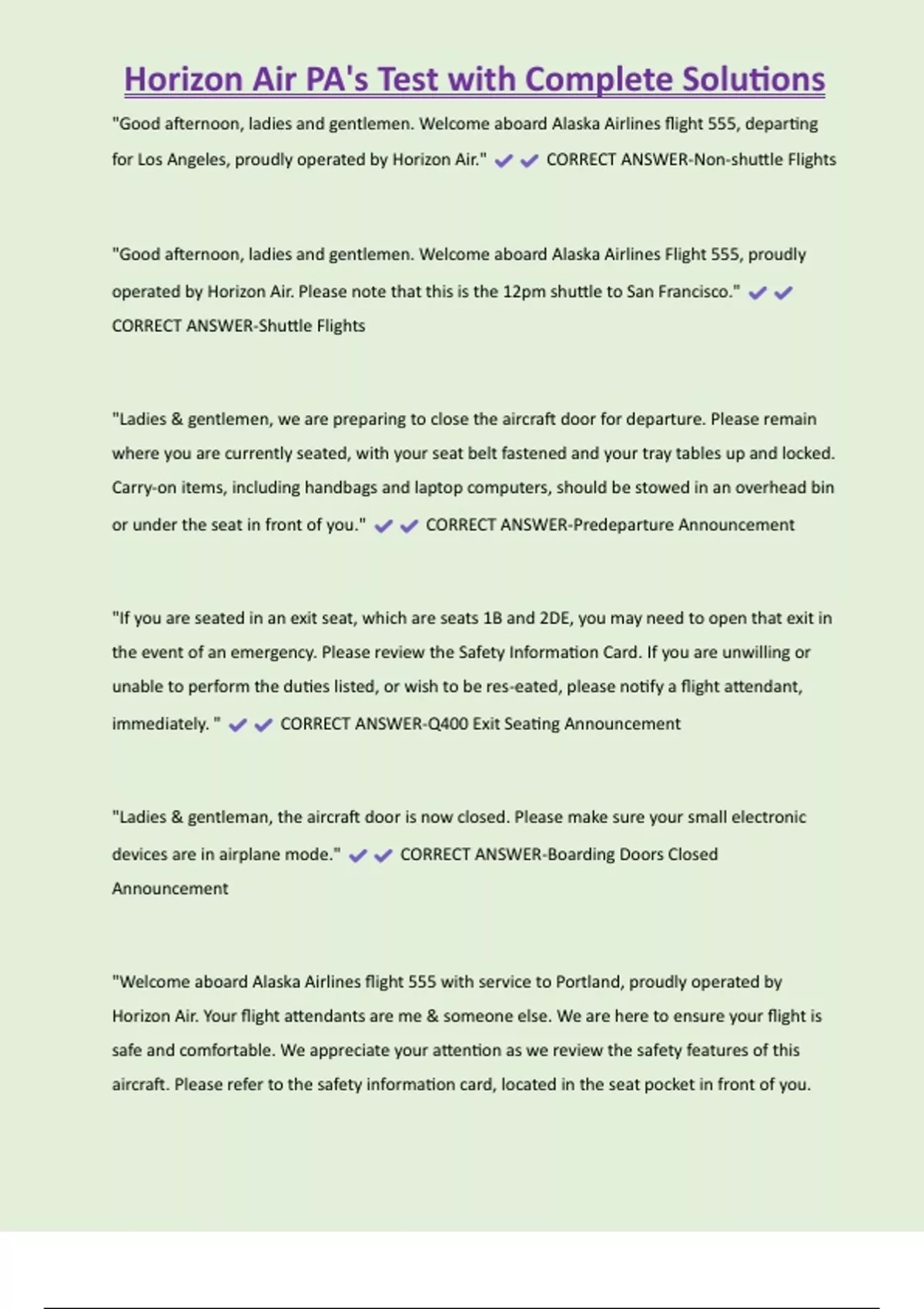 Horizon Air PA's Test with Complete Solutions "Good afternoon, ladies and gentlemen. Welcome aboard Alaska Airlines flight 555, departing for Los Angeles, proudly operated by Horizon Air." CORRECT ANSWER-Non-shuttle Flights "Good afternoon, ladies and gentlemen. Welcome aboard Alaska Airlines Flight 555, proudly operated by Horizon Air. Please note that this is the 12pm shuttle to San Francisco." CORRECT ANSWER-Shuttle Flights