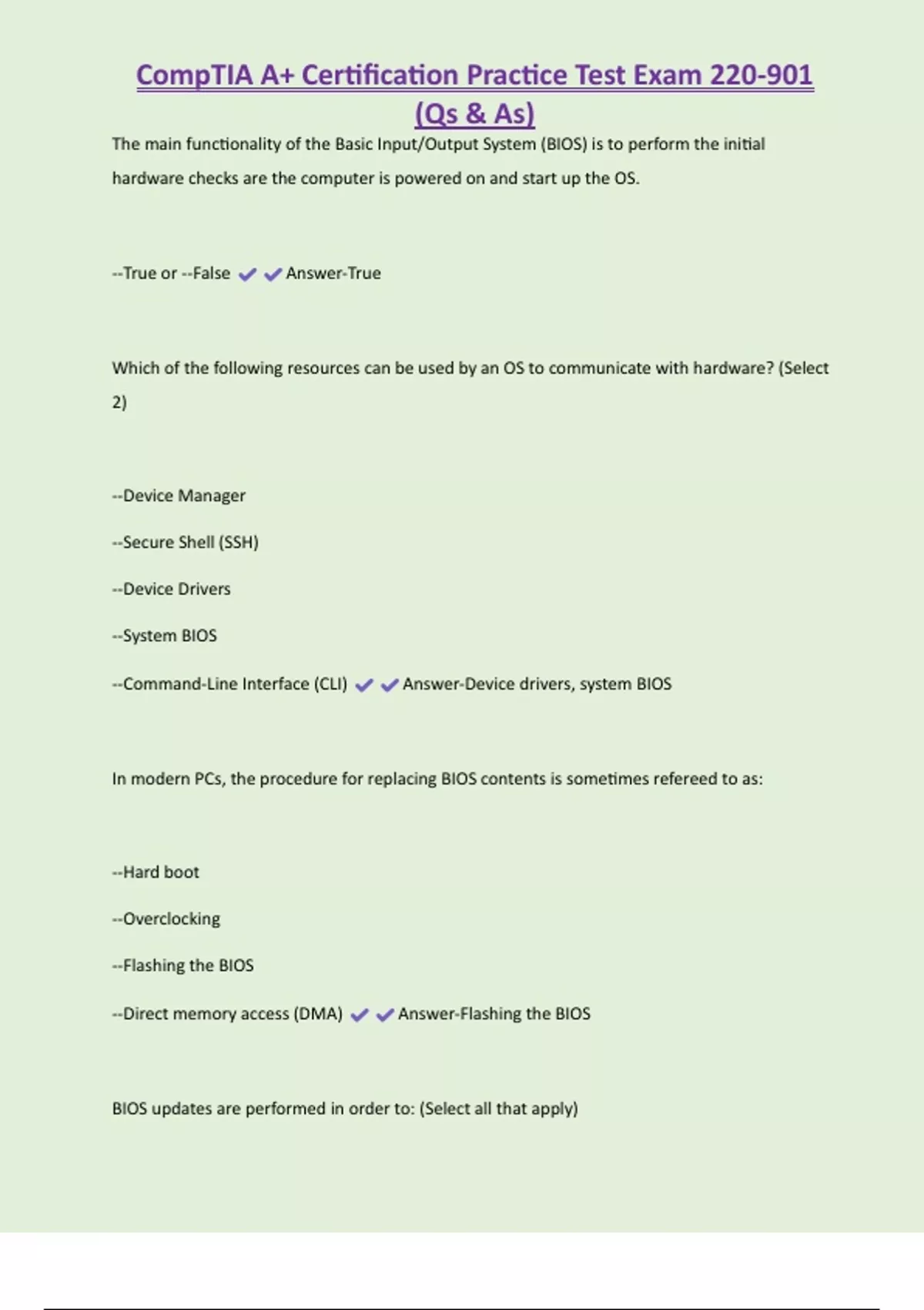CompTIA A+ Certification Practice Test Exam 220-901 (Qs & As) The main functionality of the Basic Input/Output System (BIOS) is to perform the initial hardware checks are the computer is powered on and start up the OS. --True or --False Answer-True Which of the following resources can be used by an OS to communicate with hardware? (Select 2) --Device Manager --Secure Shell (SSH) --Device Drivers --System BIOS --Command-Line Interface (CLI) Answer-Device drivers, system BIOS