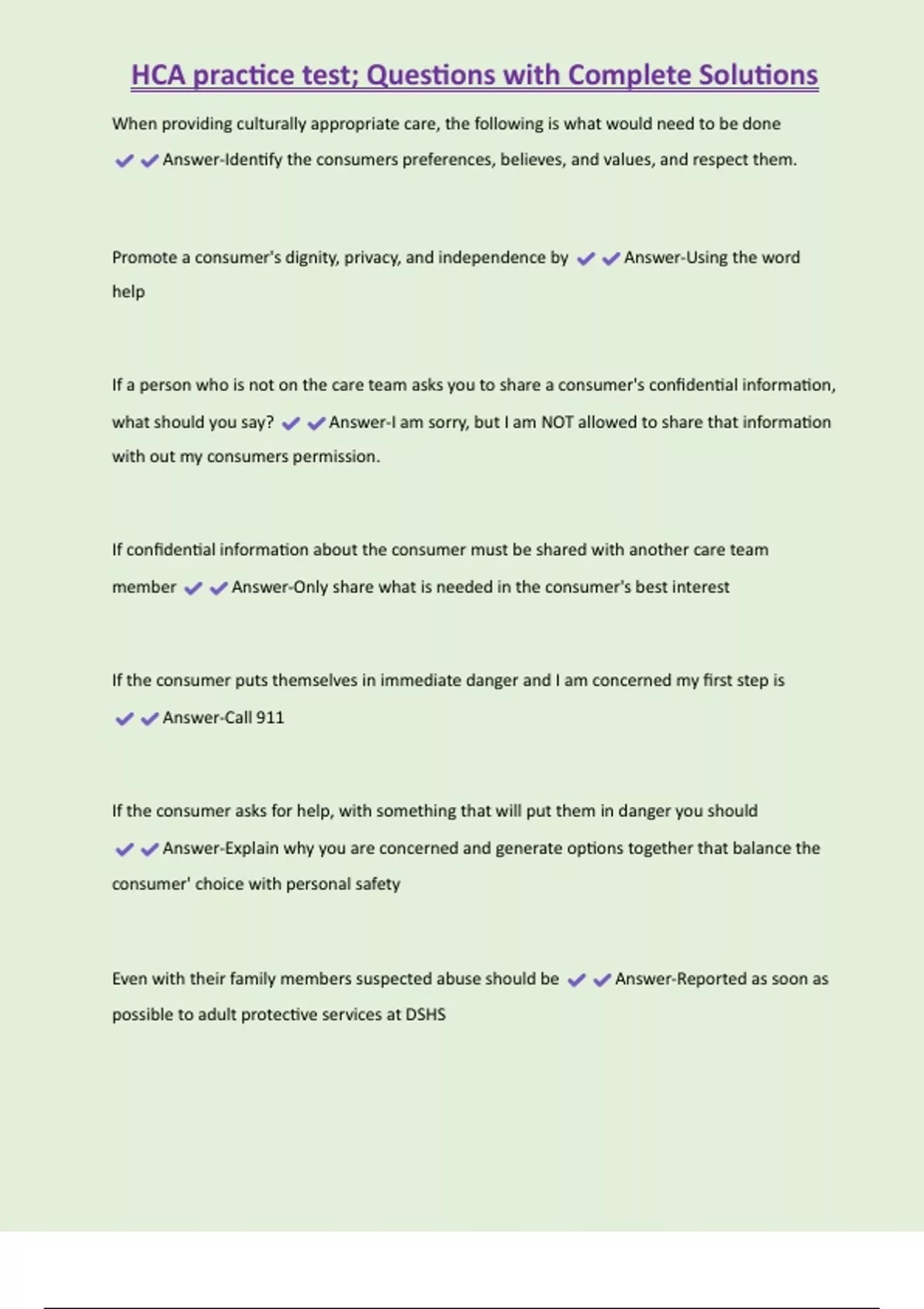 HCA practice test; Questions with Complete Solutions When providing culturally appropriate care, the following is what would need to be done Answer-Identify the consumers preferences, believes, and values, and respect them. Promote a consumer's dignity, privacy, and independence by Answer-Using the word help If a person who is not on the care team asks you to share a consumer's confidential information, what should you say? Answer-I am sorry, but I am NOT allowed to share that information with out my consumers permission