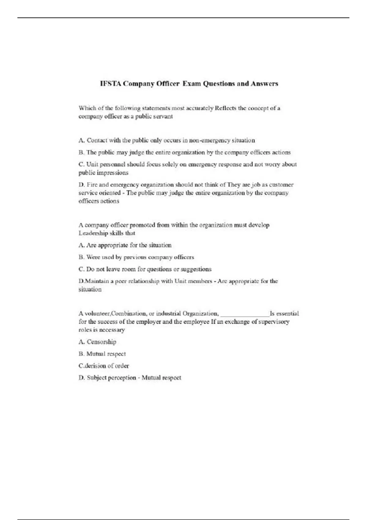 Which of the following statements most accurately Reflects the concept of a company officer as a public servant A. Contact with the public only occurs in non-emergency situation B. The public may judge the entire organization by the company officers actions C. Unit personnel should focus solely on emergency response and not worry about public impressions D. Fire and emergency organization should not think of They are job as customer service oriented - The public may judge the entire organization by the company officers actions A company officer promoted from within the organization must develop Leadership skills that A. Are appropriate for the situation B. Were used by previous company officers C. Do not leave room for questions or suggestions D.Maintain a peer relationship with Unit members - Are appropriate for the situation A volunteer,Combination, or industrial Organization, _______________Is essential for the success of the employer and the employee If an exchange of supervisory roles is necessary A. Censorship B. Mutual respect C.derision of order D. Subject perception - Mutual respectWithout appropriate understanding of the relationship between the unit member and the New officer the unit will most likely A. Thrive B. Suffer C. Expand D. Commit - Suffer Which of the following leadership skills is the ability to anticipate, embrace, and meet change? A. Preparedness B. Decisiveness C. Proactiveness D. Empowerment - Proactiveness Funding for municipal and Emergency service organizations A. May come from subscription fees B.Comes from State/provincial budgets C. Must not come from the collection of taxes D. Comes exclusively from billing users for part cost of services - May come from Subscription fees