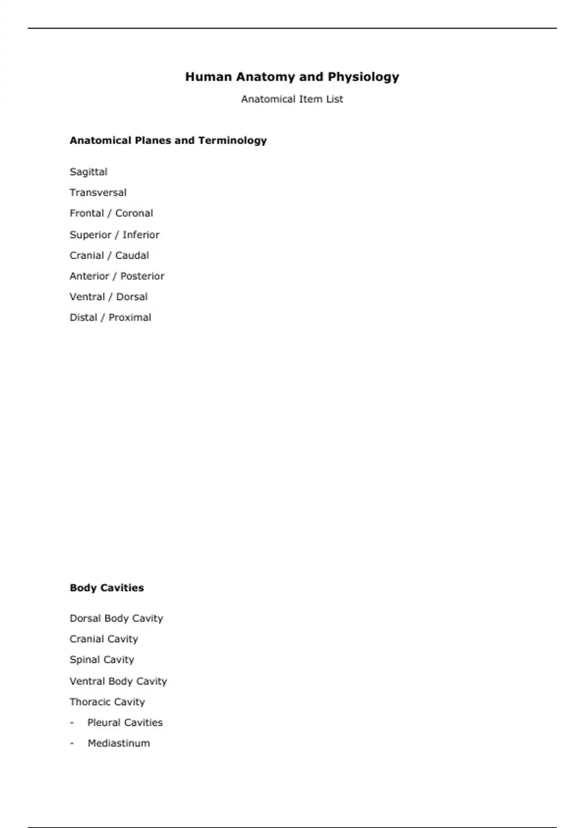 A list with all the anatomical items you need to study for the EXAM of 'Human Anatomy and Physiology' (AB_1197).