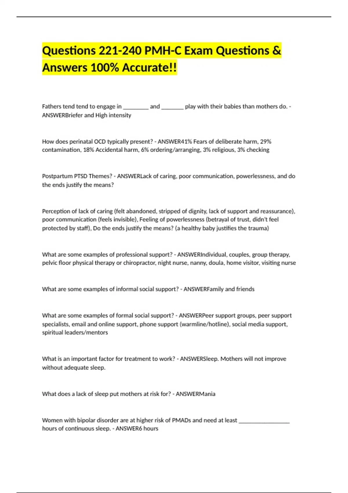 Fathers tend tend to engage in ________ and _______ play with their babies than mothers do. - ANSWERBriefer and High intensity How does perinatal OCD typically present? - ANSWER41% Fears of deliberate harm, 29% contamination, 18% Accidental harm, 6% ordering/arranging, 3% religious, 3% checking Postpartum PTSD Themes? - ANSWERLack of caring, poor communication, powerlessness, and do the ends justify the means? Perception of lack of caring (felt abandoned, stripped of dignity, lack of support and reassurance), poor communication (feels invisible), Feeling of powerlessness (betrayal of trust, didn't feel protected by staff), Do the ends justify the means? (a healthy baby justifies the trauma) What are some examples of professional support? - ANSWERIndividual, couples, group therapy, pelvic floor physical therapy or chiropractor, night nurse, nanny, doula, home visitor, visiting nurse What are some examples of informal social support? - ANSWERFamily and friends What are some examples of formal social support? - ANSWERPeer support groups, peer support