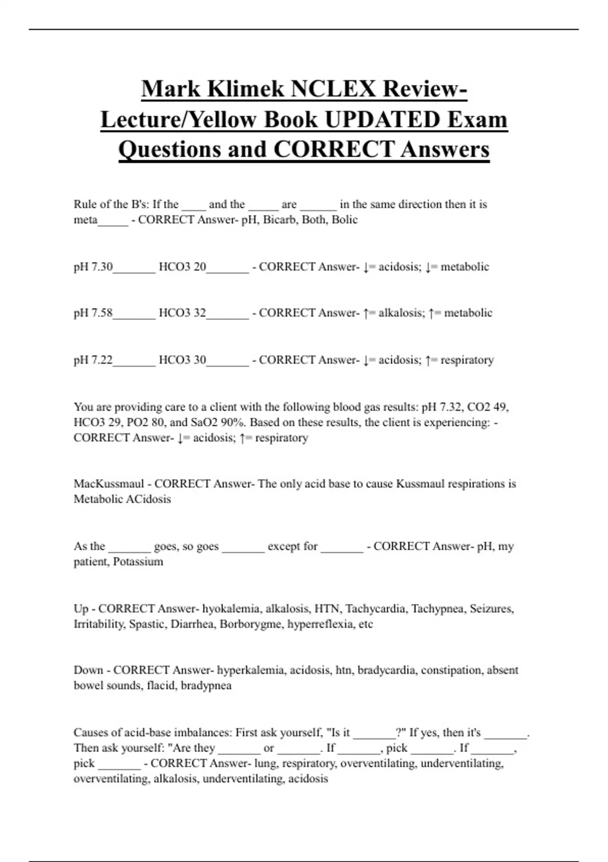pH 7.22_______ HCO3 30_______ - CORRECT Answer- ↓= acidosis; ↑= respiratory