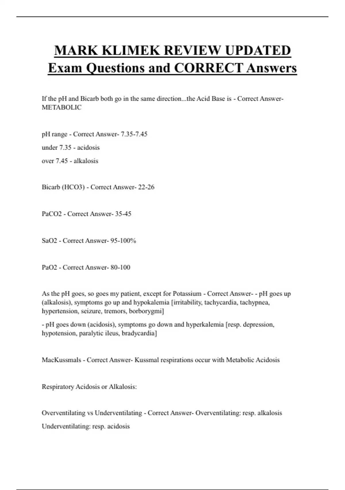 MacKussmals - Correct Answer- Kussmal respirations occur with Metabolic Acidosis