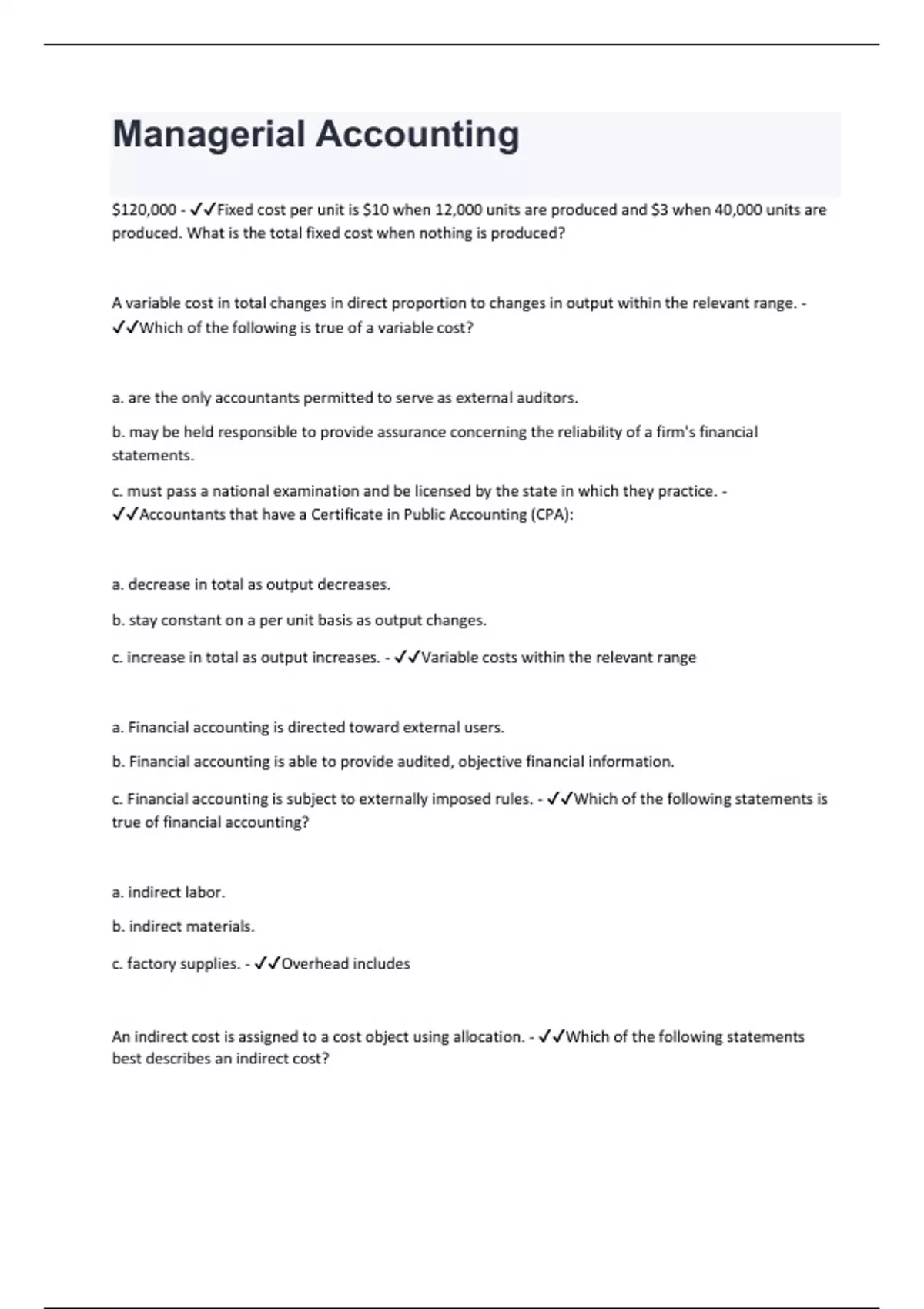 $120,000 - Fixed cost per unit is $10 when 12,000 units are produced and $3 when 40,000 units are produced. What is the total fixed cost when nothing is produced? A variable cost in total changes in direct proportion to changes in output within the relevant range. - Which of the following is true of a variable cost? a. are the only accountants permitted to serve as external auditors. b. may be held responsible to provide assurance concerning the reliability of a firm's financial statements. c. must pass a national examination and be licensed by the state in which they practice. - Accountants that have a Certificate in Public Accounting (CPA): a. decrease in total as output decreases. b. stay constant on a per unit basis as output changes. c. increase in total as output increases. - Variable costs within the relevant range a. Financial accounting is directed toward external users. b. Financial accounting is able to provide audited, objective financial information. c. Financial accounting is subject to externally imposed rules. - Which of the following statements is true of financial accounting? a. indirect labor. b. indirect materials. c. factory supplies. - Overhead includes An indirect cost is assigned to a cost object using allocation. - Which of the following statements best describes an indirect cost?direct materials - Which of the following would not be a period cost? discretionary fixed cost - Cost of advertising is an example of a _____. insurance and depreciation are fixed costs. - Taran Company incurred the following costs for the months of January and February. Type of Cost January February Insurance $5,000 $5,000 Utilities 4,000 5,000 Depreciation 3,500 3,500 Materials 10,000 20,000 Managerial Accounting - The provision of accounting information for internal users is known as Price must be greater than cost for a firm to earn income. - Which of the following is true of price? To produce information for external users, including investors, creditors, customers, suppliers, and government agencies - Which of the following is not an objective of managerial accounting