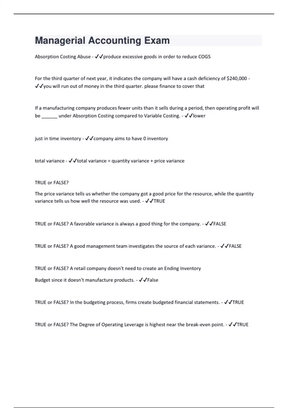 Absorption Costing Abuse - produce excessive goods in order to reduce COGS For the third quarter of next year, it indicates the company will have a cash deficiency of $240,000 - you will run out of money in the third quarter. please finance to cover that If a manufacturing company produces fewer units than it sells during a period, then operating profit will be ______ under Absorption Costing compared to Variable Costing. - lower just in time inventory - company aims to have 0 inventory total variance - total variance = quantity variance + price variance TRUE or FALSE? The price variance tells us whether the company got a good price for the resource, while the quantity variance tells us how well the resource was used. - TRUE TRUE or FALSE? A favorable variance is always a good thing for the company. - FALSE TRUE or FALSE? A good management team investigates the source of each variance. - FALSE TRUE or FALSE? A retail company doesn't need to create an Ending Inventory Budget since it doesn't manufacture products. - False TRUE or FALSE? In the budgeting process, firms create budgeted financial statements. - TRUE TRUE or FALSE? The Degree of Operating Leverage is highest near the break-even point. - TRUE