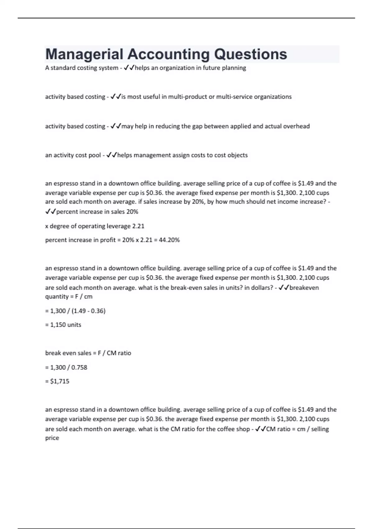 are sold each month on average. what is the CM ratio for the coffee shop - ✔✔CM ratio = cm / selling