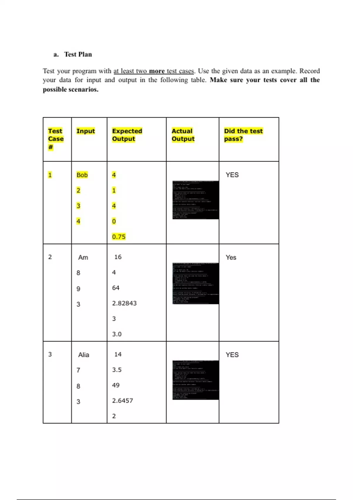 your data for input and output in the following table. Make sure your tests cover all the