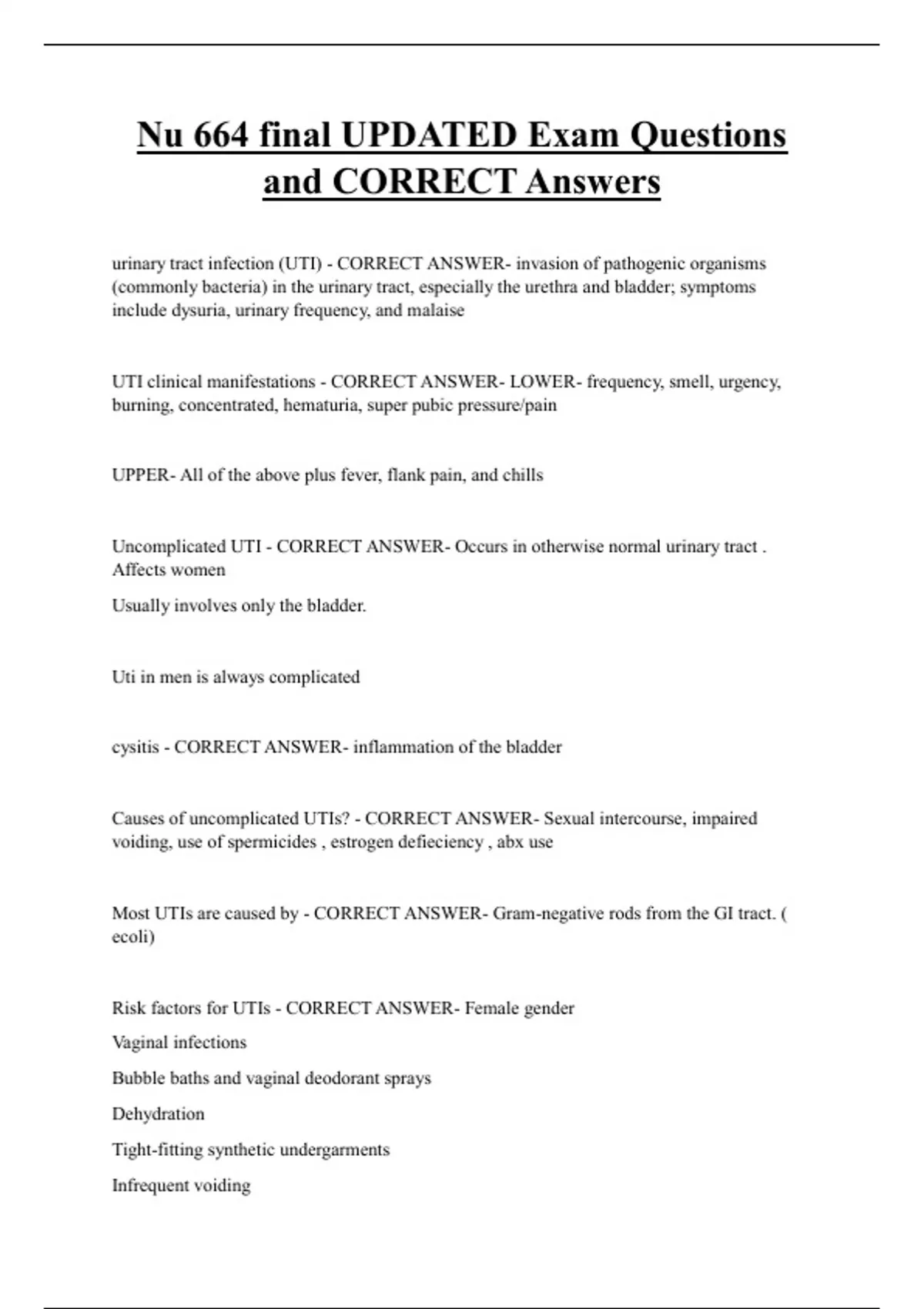 Nu 664 final UPDATED Exam Questions and CORRECT Answers urinary tract infection (UTI) - CORRECT ANSWER- invasion of pathogenic organisms (commonly bacteria) in the urinary tract, especially the urethra and bladder; symptoms include dysuria, urinary frequency, and malaise UTI clinical manifestations - CORRECT ANSWER- LOWER- frequency, smell, urgency, burning, concentrated, hematuria, super pubic pressure/pain UPPER- All of the above plus fever, flank pain, and chills Uncomplicated UTI - CORRECT ANSWER- Occurs in otherwise normal urinary tract . Affects women Usually involves only the bladder