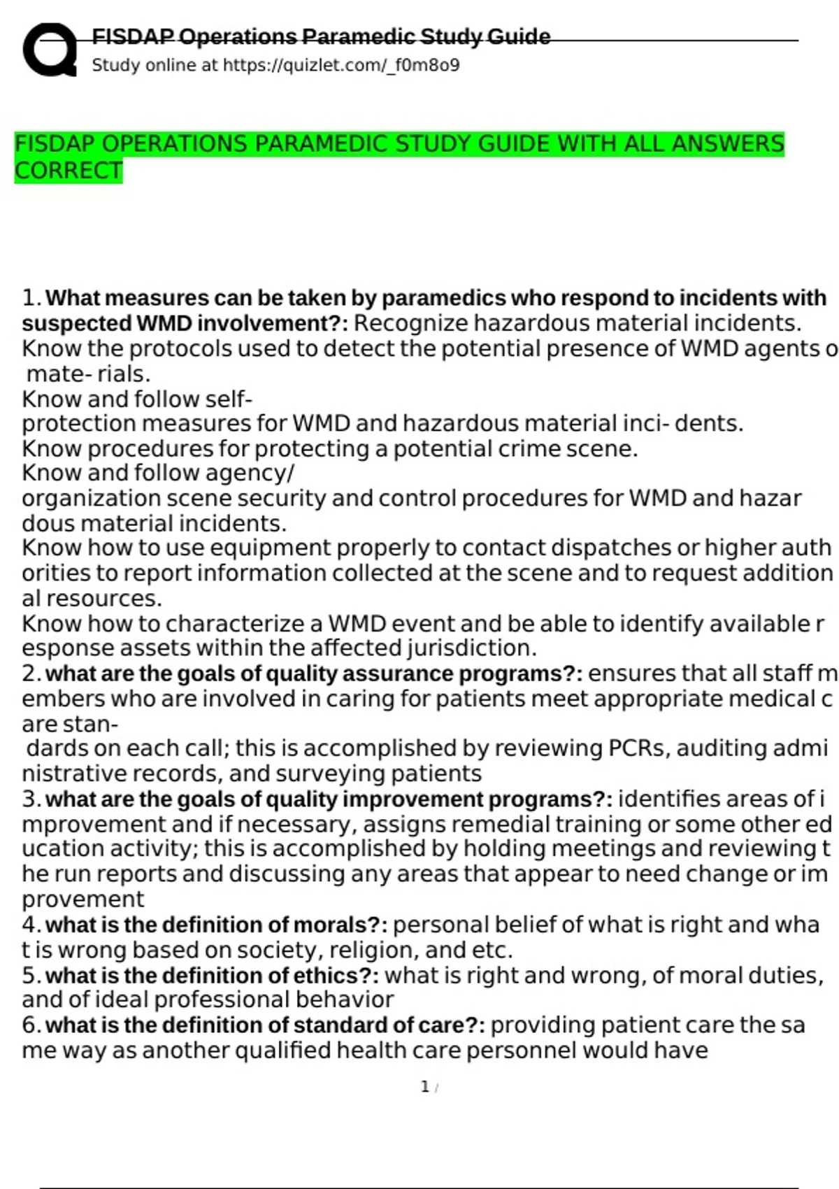 FISDAP OPERATIONS PARAMEDIC STUDY GUIDE WITH ALL ANSWERS
