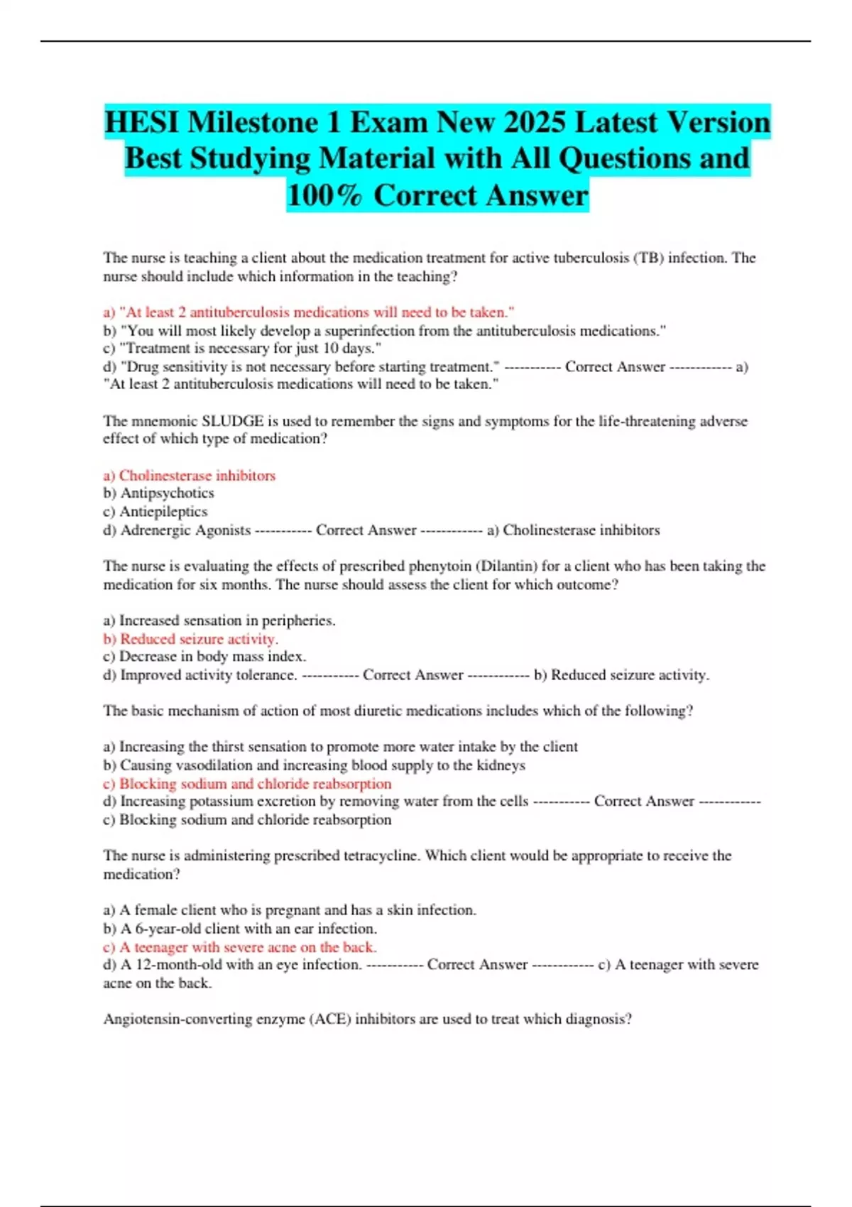 HESI Milestone 1 Exam New 2025 Latest Version Best Studying Material with All Questions and 100% Correct Answer