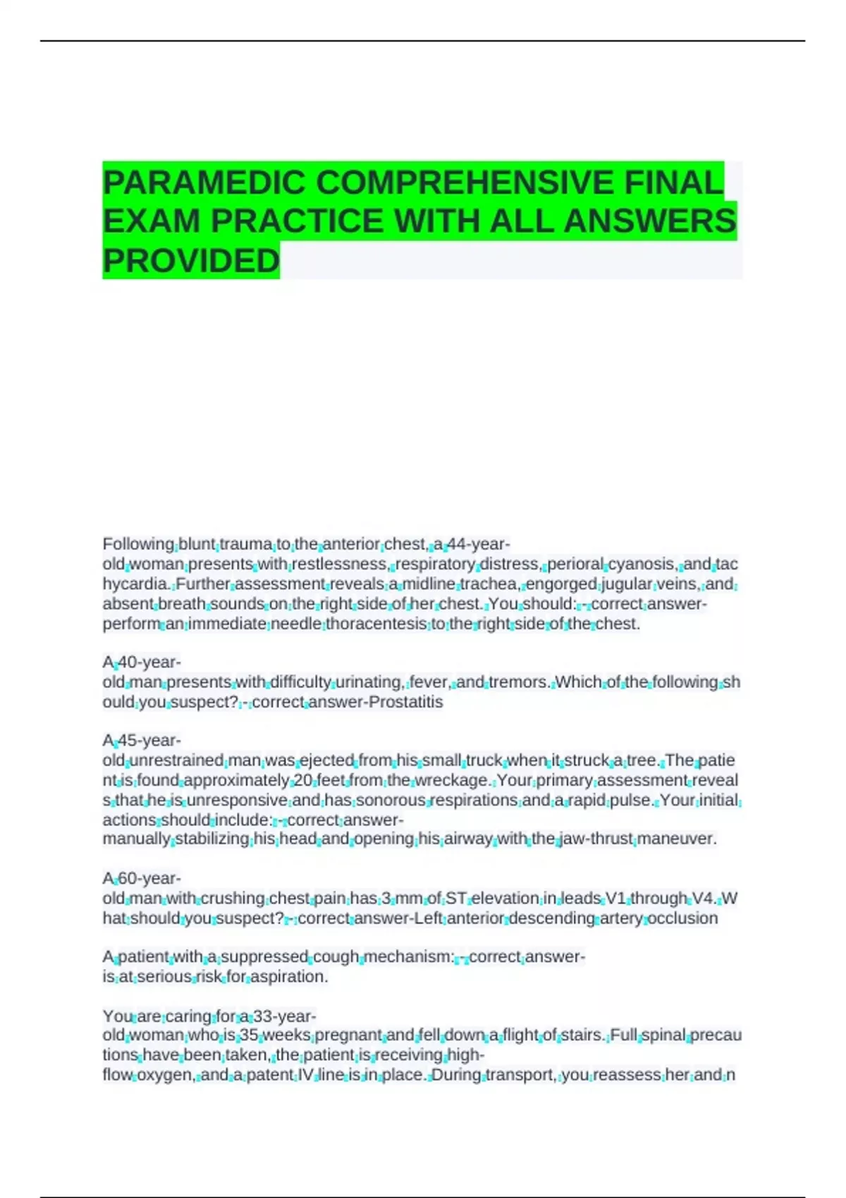PARAMEDIC COMPREHENSIVE FINAL EXAM PRACTICE WITH ALL ANSWERS PROVIDED