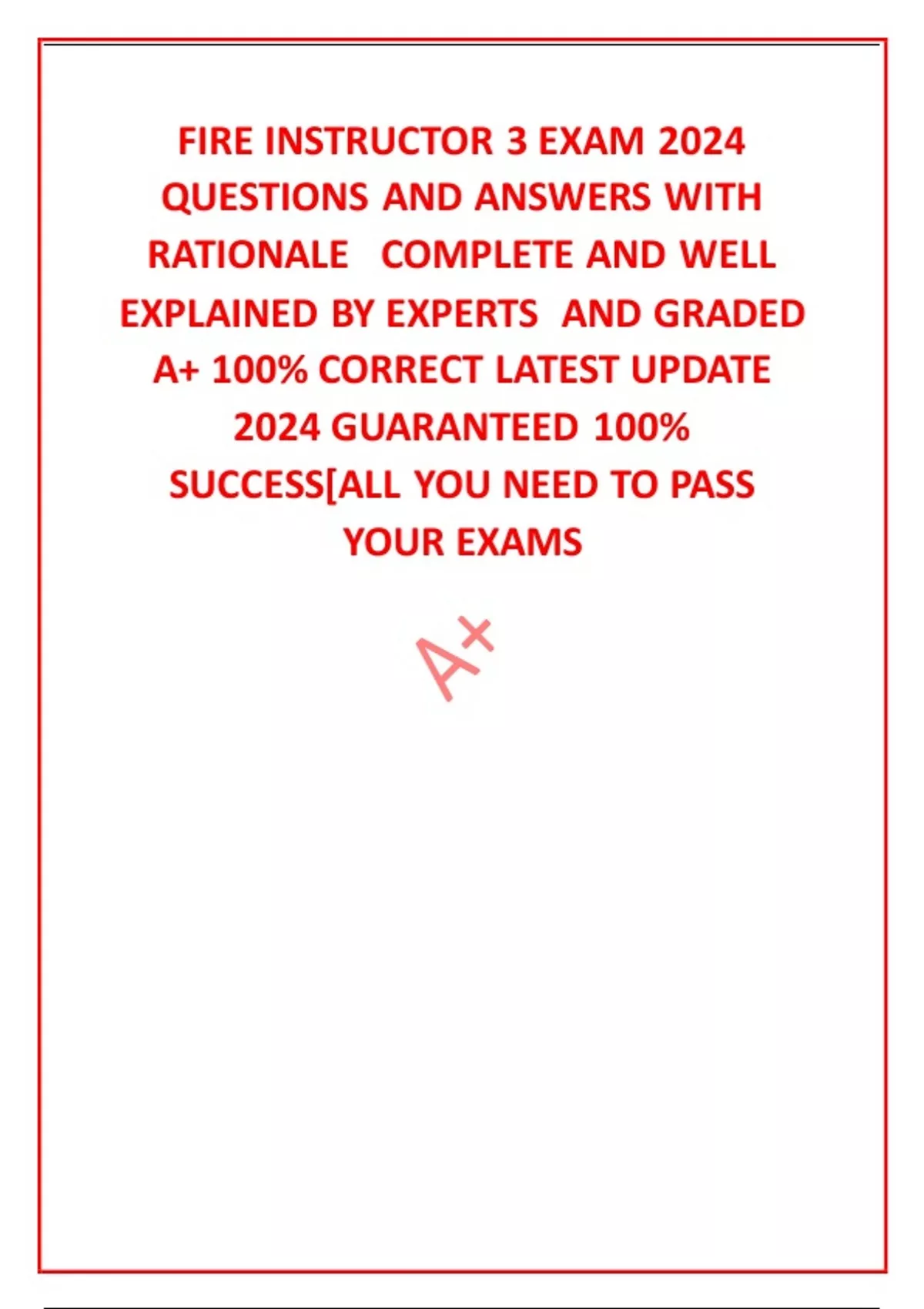 FIRE INSTRUCTOR 3 EXAM 2024 QUESTIONS AND ANSWERS WITH RATIONALE COMPLETE AND WELL EXPLAINED BY EXPERTS AND GRADED A+ 100% CORRECT LATEST UPDATE 2024 GUARANTEED 100% SUCCESS[ALL YOU NEED TO PASS YOUR EXAMS Desire to teach Which characteristic of an effective instructor can generate enthusiasm in students and administrators? Strong interpersonal skills Which characteristic of an effective instructor shows sensitivity? Motivation Which characteristic of an effective instructor encourages students as they attempt to learn? Preparation and organization Which characteristic of an effective instructor involves practicing their presentation to determine whether sufficient time is scheduled? Empathy The ability to understand the feelings and attitudes of another person is known as: Fairness Which characteristic of an effective instructor evaluates performance against an established objective? Sincerity The quality of being open and truthful that will encourage students to react, respond, and cooperate more positively is: Vocation that requires specialized knowledge and long preparation The term professionalism is defined as a: Members of a profession are committed to continued study and educational advancement Which f the following statements about a profession is MOST accurate? Providing effective training that is safe Which of the following is an instructors obligation to the student? Providing training that supports the departments mission Which of the following is an instructors obligation to the organization?