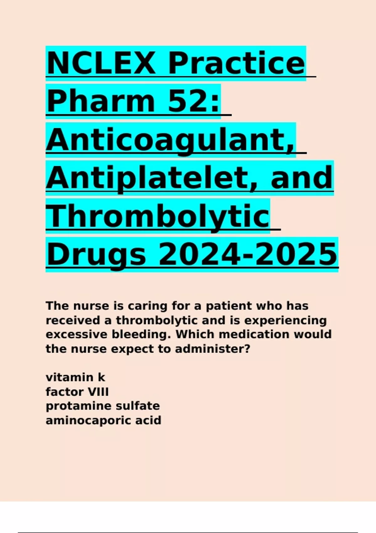 NCLEX Practice Pharm 52 Anticoagulant, Antiplatelet, and Thrombolytic Drugs