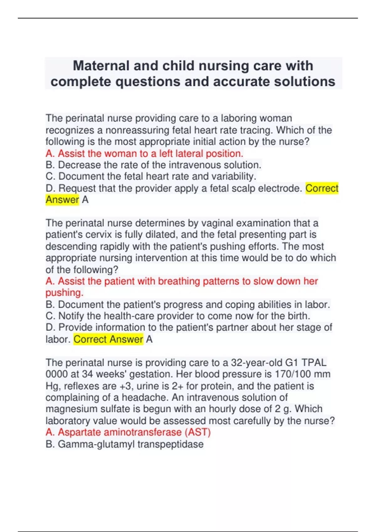 labor. Correct Answer A