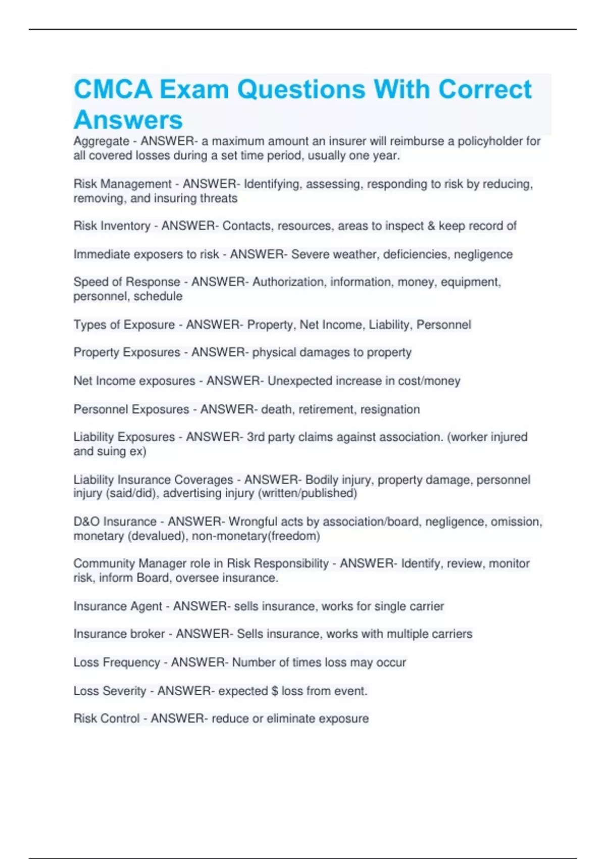 CMCA Exam Questions With Correct Answers Aggregate - ANSWER- a maximum amount an insurer will reimburse a policyholder for all covered losses during a set time period, usually one year. Risk Management - ANSWER- Identifying, assessing, responding to risk by reducing, removing, and insuring threats Risk Inventory - ANSWER- Contacts, resources, areas to inspect & keep record of Immediate exposers to risk - ANSWER- Severe weather, deficiencies, negligence Speed of Response - ANSWER- Authorization, information, money, equipment, personnel, schedule Types of Exposure - ANSWER- Property, Net Income, Liability, Personnel Property Exposures - ANSWER- physical damages to property Net Income exposures - ANSWER- Unexpected increase in cost/money Personnel Exposures - ANSWER- death, retirement, resignation Liability Exposures - ANSWER- 3rd party claims against association. (worker injured and suing ex) Liability Insurance Coverages - ANSWER- Bodily injury, property damage, personnel injury (said/did), advertising injury (written/published) D&O Insurance - ANSWER- Wrongful acts by association/board, negligence, omission, monetary (devalued), non-monetary(freedom) Community Manager role in Risk Responsibility - ANSWER- Identify, review, monitor risk, inform Board, oversee insurance. Insurance Agent - ANSWER- sells insurance, works for single carrier Insurance broker - ANSWER- Sells insurance, works with multiple carriers Loss Frequency - ANSWER- Number of times loss may occur Loss Severity - ANSWER- expected $ loss from event. Risk Control - ANSWER- reduce or eliminate exposure Risk Financing - ANSWER- Options to cover $ of loss Exposure avoidance - ANSWER- eliminating chance of loss Loss Prevention - ANSWER- reducing likelihood of loss (training, inspections) Loss Reduction - ANSWER- reducing severity of loss (fire sprinkler) Contractual Transfer - ANSWER- shift loss from association to other (ex. vendor, insurance) Risk Retention - ANSWER- association finds way to pay for losses Risk Transfer - ANSWER- association finds way to transfer responsibility to another party