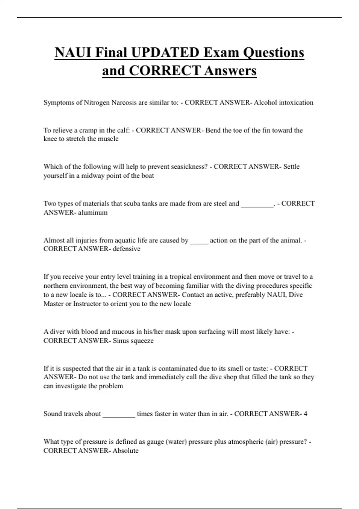 Symptoms of Nitrogen Narcosis are similar to: - CORRECT ANSWER- Alcohol intoxication