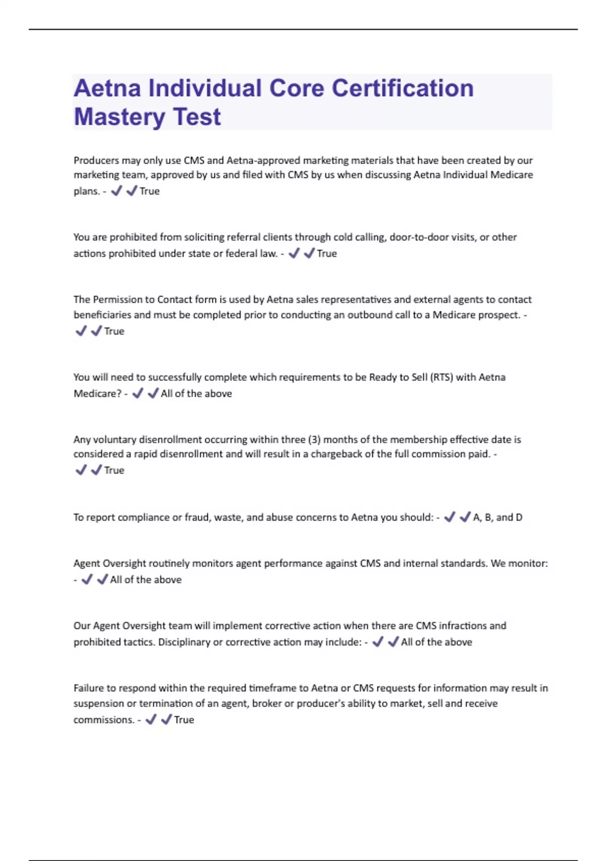 Producers may only use CMS and Aetna-approved marketing materials that have been created by our marketing team, approved by us and filed with CMS by us when discussing Aetna Individual Medicare plans. - True You are prohibited from soliciting referral clients through cold calling, door-to-door visits, or other actions prohibited under state or federal law. - True The Permission to Contact form is used by Aetna sales representatives and external agents to contact beneficiaries and must be completed prior to conducting an outbound call to a Medicare prospect. - True You will need to successfully complete which requirements to be Ready to Sell (RTS) with Aetna Medicare? - All of the above Any voluntary disenrollment occurring within three (3) months of the membership effective date is considered a rapid disenrollment and will result in a chargeback of the full commission paid. - True To report compliance or fraud, waste, and abuse concerns to Aetna you should: - A, B, and D Agent Oversight routinely monitors agent performance against CMS and internal standards. We monitor: - All of the above Our Agent Oversight team will implement corrective action when there are CMS infractions and prohibited tactics. Disciplinary or corrective action may include: - All of the above Failure to respond within the required timeframe to Aetna or CMS requests for information may result in suspension or termination of an agent, broker or producer's ability to market, sell and receive commissions. - TrueA prohibited marketing activity is: - All of the above How long are you required to maintain Scope of Appointment (SOA) documentation? - 10 years If a beneficiary requests to discuss other products not originally documented on the SOA, you must document a second SOA for the additional product type before the appointment may continue. - True You must direct all requests to cancel, withdraw, or terminate enrollment applications to the same location where the application was originally submitted or call the Member Services number on the member ID card. - True When obtaining a Scope of Appointment, you may NOT: - All of the above What report(s) are available on Aetna Producer World? - All of the above If a prospect calls to RSVP for a meeting, a Permission to Contact form is not required for that meeting but would be required for a representative to place a follow-up call to a meeting attendee. - True