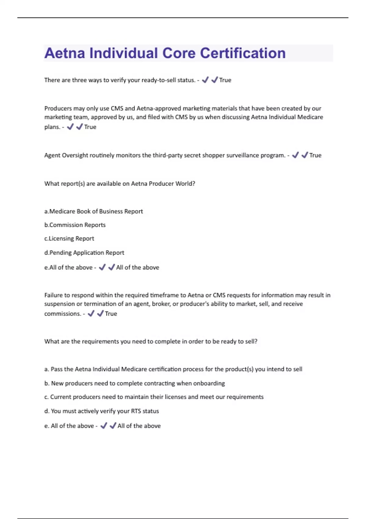 There are three ways to verify your ready-to-sell status. - True Producers may only use CMS and Aetna-approved marketing materials that have been created by our marketing team, approved by us, and filed with CMS by us when discussing Aetna Individual Medicare plans. - True Agent Oversight routinely monitors the third-party secret shopper surveillance program. - True What report(s) are available on Aetna Producer World? a.Medicare Book of Business Report b.Commission Reports c.Licensing Report d.Pending Application Report e.All of the above - All of the above Failure to respond within the required timeframe to Aetna or CMS requests for information may result in suspension or termination of an agent, broker, or producer's ability to market, sell, and receive commissions. - True What are the requirements you need to complete in order to be ready to sell? a. Pass the Aetna Individual Medicare certification process for the product(s) you intend to sell b. New producers need to complete contracting when onboarding c. Current producers need to maintain their licenses and meet our requirements d. You must actively verify your RTS status e. All of the above - All of the aboveYou must verify with us that you're "ready to sell." You can view your ready to sell status using our interactive map on Producer World or you can contact your recruiter or Aetna Medicare Broker Services. You can receive commission for any sale that results from an unreported marketing/sales event. - False To order enrollment kits for Aetna Medicare products, you must be Ready to Sell (RTS) and access Aetna branded kits through a single point of entry, using your NPN to log in. - True Use the appropriate CMS-approved consumer sales presentation from beginning to end, read the presentation notes or talking points, and, if/when you use the MA/MAPD/PDP sales video, it should be in conjunction with the approved sales presentation. - True You must direct all requests to cancel, withdraw, or terminate enrollment applications to the same location where the application was originally submitted or call the Member Services number on the member ID card. - True